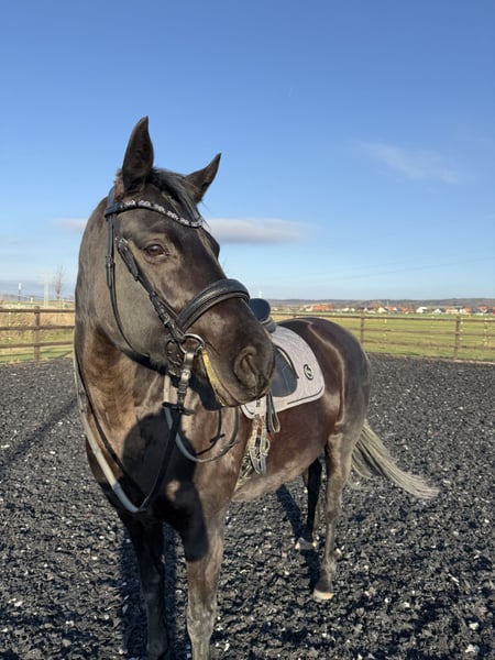 Mare | 9 years old (04/2016) | approx. 16.1 hh | Black Ridden mainly for leisure Safe in terrain and traffic Very gentle in handling Familiar with groundwork, lunging, double lunge, side reins, etc. Well-behaved with the farrier, veterinarian, and during loading Healthy, teeth checked once a year by a equine dentist Open stable/stall housing known Location: Salzgitter, 38259 Price: €12,500 Trial ride available for a fee of €50, which will be deducted from the purchase price.