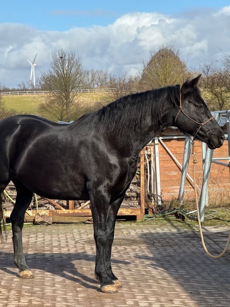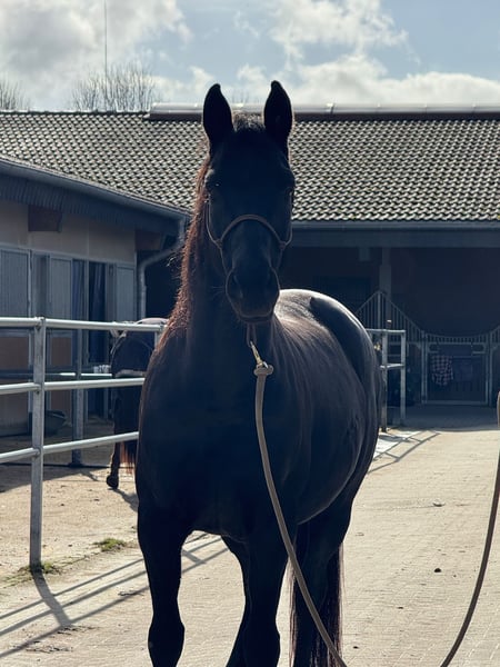 Schweren Herzens verkaufen wir unsere 10 jährige Hannoveranerstute von Schwarzgold x Don Frederico. Ihr Stockmaß beträgt 1,60. In der Vergangenheit hat sie drei Fohlen bekommen. Aktuell ist sie zum Anreiten bei Lisanne Hähndel. Im Training dort zeigt sie sich motiviert und mit ordentlich „Go“. Sie bringt alles mit, was man sich von einer zukünftigen Partnerin wünscht. Gleichzeitig ist sie sehr menschenbezogen, liebt ausgiebige Kuscheleinheiten und möchte ihrem Menschen einfach gefallen. Sie zeigt sich dort sehr lernwillig, aufmerksam und mit großem Potenzial für ihre weitere Ausbildung. Sie arbeitet motiviert mit und bringt viel Herz sowie eine positive Arbeitseinstellung mit. Aufgrund ihrer Sensibilität sucht sie eine liebevolle, aber konsequente Führung durch eine erfahrene Bezugsperson, die ihr Sicherheit gibt und sie fair weiter ausbildet. Bei passender Förderung entwickelt sie sich zu einer tollen Partnerin mit feinem Charakter. Eine Stute mit ganz viel Herz, die mit ihrem Menschen eng verbunden sein möchte. Im Januar/Februar 2026 war der Zahnarzt und die Osteopathin da. Reitvideos sind vorhanden und können auf Anfrage verschickt werden.