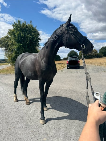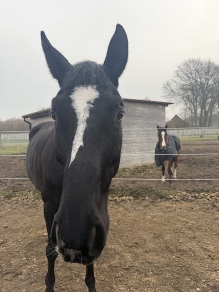 Unfortunately, due to unforeseen circumstances, I am heartbroken to seek a companion home for my mare Dahlia. She is a Hanoverian, 17.5 hands, 13 years old, and NOT suitable for breeding. Due to a medical condition, she is not rideable, but she can go for walks and be worked on the ground at a walk, during which she is completely unproblematic. In the paddock, she is free to move as she pleases. All information regarding her diagnosis, veterinary reports, etc., will be transparently shared with serious inquiries. She currently does not require any supplements or medications. At the moment, she lives in a large open stable with 24/7 hay, in a group of three, and feels very comfortable there. She is also used to coming in at night. She tends to be higher in the pecking order but is very fair and social. She shares her paddock well with a very low-ranking mare and a miniature shetland pony, even during shared feeding. Dahlia needs some time to settle into a new environment and to open her heart to a new person. Once she has done so, she is honest and affectionate. She is sensitive and can sometimes be a bit particular in handling. Farrier and veterinarian visits are generally possible, but depending on her mood, they may require patience. When tied up, she may dance a little, but she usually stands still and enjoys grooming. Dahlia is looking for a home with experienced horse people who have patience and will accept her as she is, without performance expectations. Once she trusts her handler, she is a very honest and extremely affectionate mare. Dahlia means a lot to me, and her future home is very important. I am aware that she is not a horse for high demands, and I especially wish for people who want to give her a wonderful life and enjoy spending time with her.