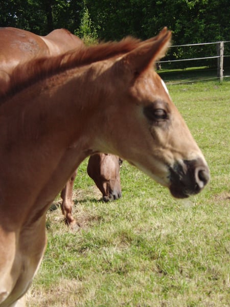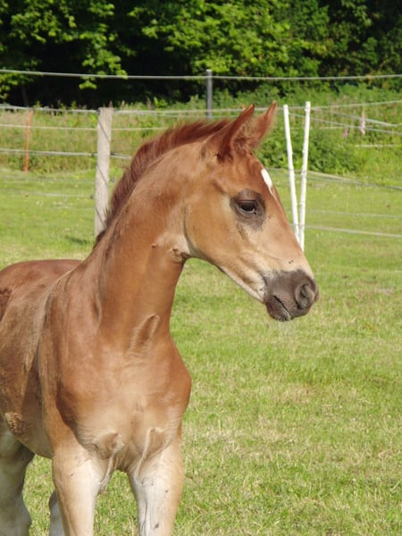 Intelligent, people-oriented, and strong-charactered chestnut filly with a good foundation and powerful movement. About her father, the State Stud Celle writes: Vidar, Viscount – Edward – Contendro – Espri: a pedigree that perfectly symbolizes dual talent. Style and ability in jumping combined with three excellent basic gaits make Vidar a perfect all-rounder, also striking in type and generous in frame: You cannot overlook Vidar! The dam's sire, Floris Prince, achieved a fantastic stallion performance test in Adelheidsdorf. With the second-highest breeding value in dressage of 143, he received a score of 9.0 for his elasticity in trot and his enormous rideability. The test riders were also thrilled with his riding comfort and awarded top scores. Furthermore, the dam's lineage from Don Vino (Donnerhall x Consul (Trak.) and then Brentano x Weingau leaves nothing to be desired. This appealing young lady has daily human contact and grows up in a herd environment with plenty of fresh air. A pleasantly uncomplicated foal. Born on April 11, 2025.