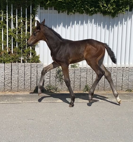 Elegant marked dark brown filly by Veneno from the elite line 1190606 "Königsheldin" For sale is an expressive dark brown filly, born from the mare Born to Dance 3 (by Bon Bravour x Wolkentanz). The sire Veneno unfortunately passed away last year – his sought-after and now rare offspring makes this foal particularly valuable, especially in terms of breeding. Special features: Long-legged, powerful build with solid substance Pronounced, dynamic movements in all basic gaits – an ideal start for a distinguished dressage career Friendly, lively, and very people-oriented, while being exceptionally cuddly The maternal line combines generations of dressage talent, reliability, and high exterior quality, evidenced by numerous sporting successes and approved stallions. Born to Dance 3 impressed even in her mare performance test with excellent rideability scores of up to 8.5. Here, a proven, performance-tested maternal line merges with the sportily highly successful blood of Veneno – a promising combination for breeding and sport. Location: North Rhine-Westphalia. Viewings possible by appointment at any time. For further information, I am at your disposal.