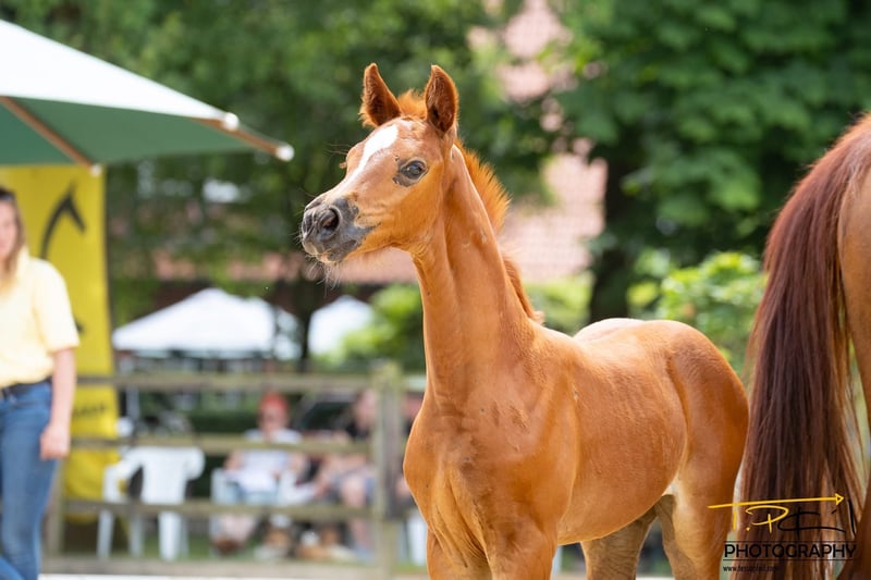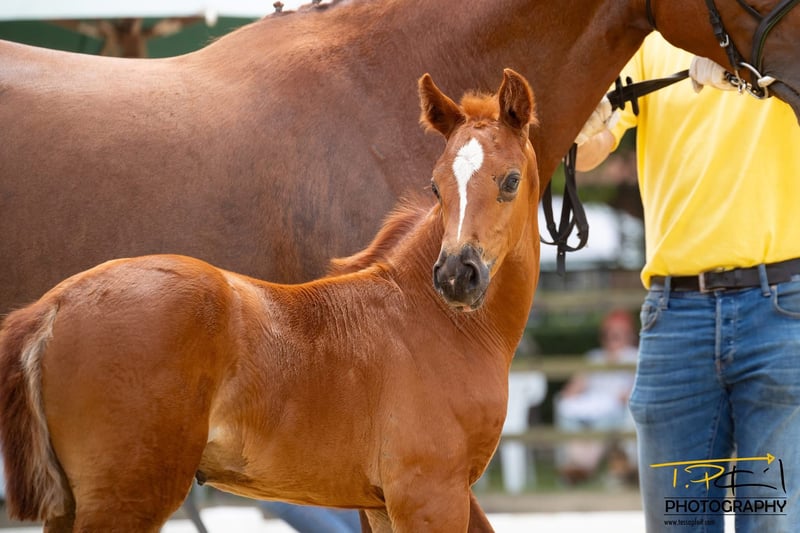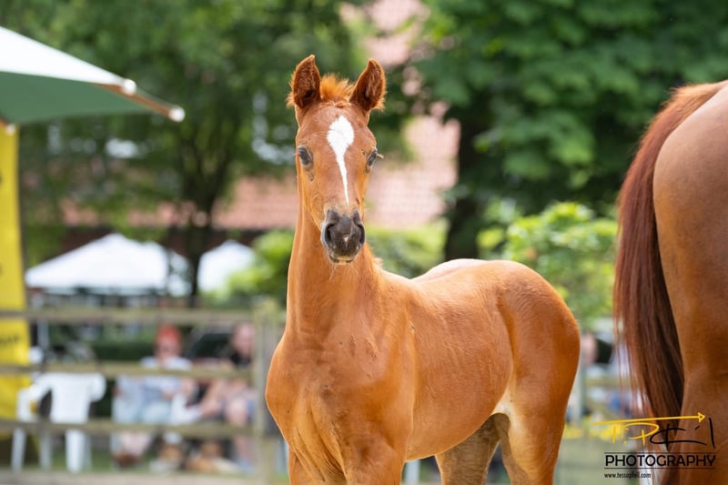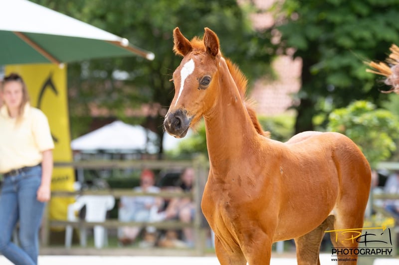 "Delia ZS" Dark chestnut filly born on 25.05.2025 Diathletico FRH – Light My Fire – Escudo II – Grand Ferdinand II - Parsival Jumping blood – it doesn't get any better than this. A foal with a lot of style and expression, showcasing excellent movement. The mother is a premium mare from Hanover, having received a top prize at both 2 and 4 years old. The mother, grandmother, and great-grandmother are all registered in the jumping horse program – both listed in the FN performance mare book in classes "A" and "D". The mother's half-brother was sold to England at the age of 3 through the Verden Elite Auction. Many horses from this lineage have already been sold at the Verden auctions. The same maternal line as the Westphalian stallion "Cornet Fever," who was once the best jumping stallion at the licensing in Münster and has since been sold to the USA. An offer for breeding and sport. She gets more stylish every day. The foal can stay at the breeder's stable for rearing. It is approved for the online auction on 04.09.2025 in Verden! We do not breed show jumpers – we breed horses with double talent.