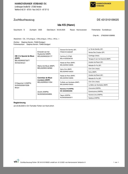 Puledra di sella di I‘m Special de Muze x Carembar de Muze x Namelus R Fratello completo *2020, attualmente alta 1,72 m, alla prima stagione da competizione ha concluso 7 su 8 percorsi senza errori e ha ottenuto la qualifica per i cavalli da salto A Ida è dissetata e attualmente in un allevamento adeguato, dove può rimanere anche dopo la vendita Sa condurre e si fa facilmente mettere le ferri Premio di selezione del Verband Hannoveriano alla fiera dei puledri di Oyten