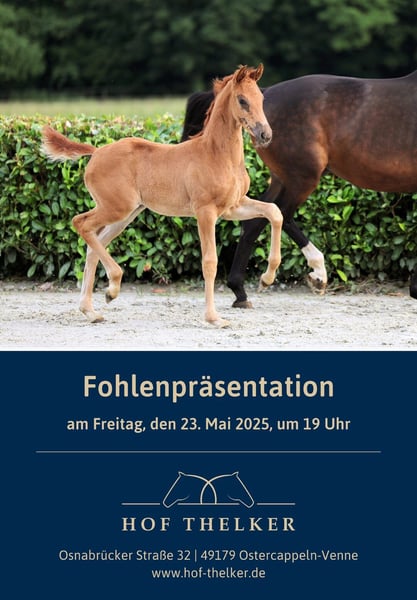 On May 23rd at 7 PM, our foal show will take place. This and approximately 20 other foals will be presented to the audience by their breeders. Many of the foals are for sale, just speak to the breeder if you like a foal! If you have any questions about the foals or the event, feel free to call me! Christian Thelker 0175 854 3529 Address: Hof Thelker Osnabrücker Str. 32 49179 Ostercappeln