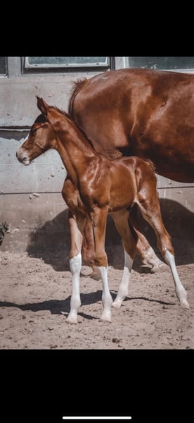 Wegens het verminderen van de voorraad verkopen wij onze 3-sterren merrie Tequila, geboren in 2005. Na twee keer embryo-overdracht hebben we in 2025 3 TOP veulens gekregen - zie laatste foto's. 2 hengstveulens staan hier te koop. Tequila is ondanks haar leeftijd in topvorm en staat tijdens de dracht en ook daarna altijd zeer goed in haar vel. Ook de embryo-overdracht heeft ze volledig probleemloos doorstaan. Rimondo: Tequila 251 Tequila is onderscheiden met de hoogste PSH (Programma Hannoveraanse Springpaardfokkerij) prijs met drie sterren ***. Tequila heeft meerdere zeer succesvolle nakomelingen in de sport. Ze is drachtig voor 2026 van de hengst Quempas van het landgestüt. Na het spenen van het veulen kan ze in de herfst verhuizen - of eventueel in pension blijven. De prijs betreft de merrie - bij eventuele drachtigheid (is gedekt met Quempas) komen de kosten voor sperma en dierenarts erbij. Locatie 06463 GEEN RUITERPAARD