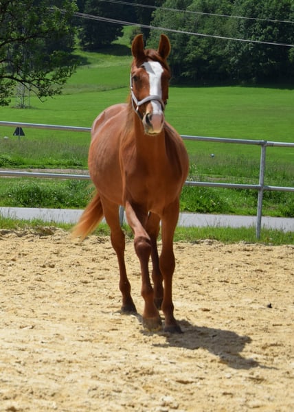 Due to unreliable buyers, this beautiful young mare is available again. Because of my retirement from breeding (due to health reasons), this tall-legged 2-year-old mare by ESCANTO PS out of BENICIO is for sale. A very sweet, affectionate, and people-oriented mare, completely clear-headed and very resilient, with excellent gaits. She is long-legged, elegant, correct, very brave, and full of charm. She is sure to become an excellent riding horse! Raised in an open stable, she is also accustomed to being stabled at night. She is regularly dewormed, vaccinated, and has been introduced to the blacksmith. The mare is likely to stay small, which might also make her interesting for pony breeding. Born April 2023, chestnut. Lineage from the SCHLIESSERIN, one of the best Hannoverian mare lines! All photos and videos are up to date.