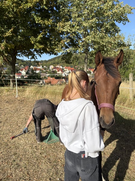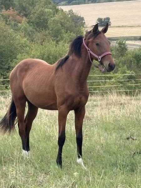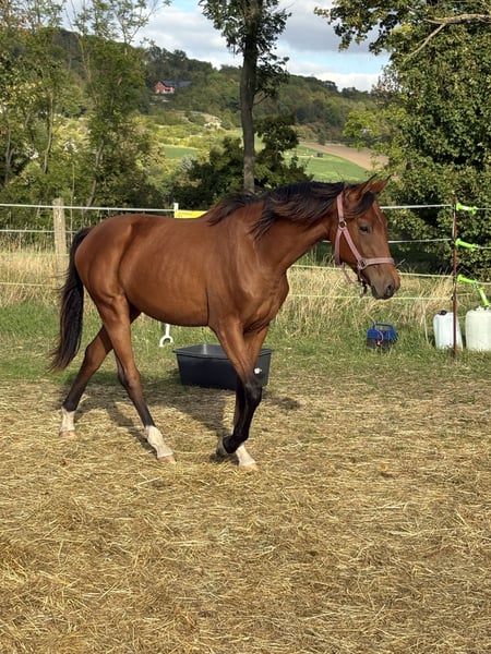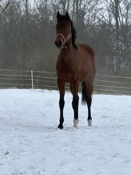 I am offering our 2-year-old mare Valhalla P into caring hands due to lack of time. She is sired by Vivaldo and comes from a Galliani Biolley dam line x Weltmeyer. She is very people-oriented and displays remarkable movement talent. A little raw diamond with great potential for the big arena. Valhalla has been exposed to all the essentials a young horse should know at her age. She is handled daily, leads willingly, is easy to groom, and stands for the farrier. She has been regularly vaccinated (influenza, tetanus, herpes), dewormed, and introduced to the farrier. Please feel free to contact me if you have any further questions.