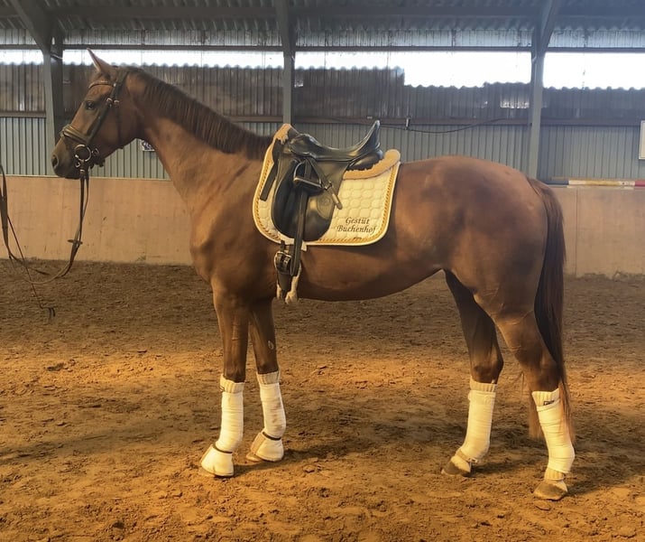 Ta córka Livaldona zachwyca swoim pięknym kolorem i wspaniałą twarzą - po prostu piękna do zakochania. Matką jest odnosząca sukcesy w sporcie jeździeckim klacz państwowa Quintessenz od Quaterbacka. Quintessenz jest również pełną siostrą Grand Prix odnoszącego sukcesy Quite Righta. Jeźdzalność Quibelle jest wspaniała, zawsze oferuje swoją pomoc z pełną motywacją i cieszy się codzienną pracą. Super wnętrze i nastawienie. To koń szkoleniowy, jakiego się pragnie! Przedstawiamy duży przegląd, przegląd jest nienaganny / w idealnym stanie (w tym szyja i grzbiet). Klacz pochodzi z własnej hodowli i była wychowywana w najlepszych warunkach oraz delikatnie ujeżdżana. Quibelle zna pastwisko - i jest absolutnie wspaniała w relacjach społecznych w stadzie. Transport i wyjazdy również całkowicie łatwe.