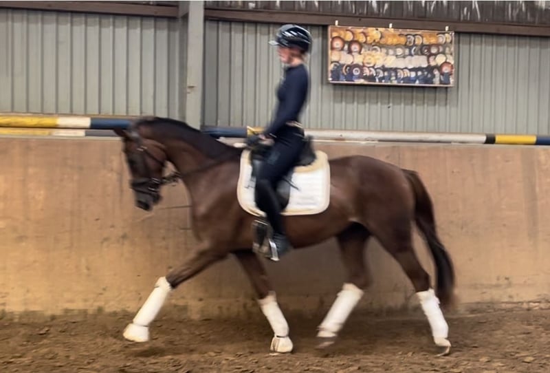 This Livaldon daughter impresses with her beautiful color and lovely face - simply stunning. Her mother is the successful state premium mare Quintessenz by Quaterback, who has excelled in dressage. Quintessenz is also a full sister to the Grand Prix successful Quite Right. Quibelle's rideability is outstanding; she always offers her cooperation with full motivation and enjoys her daily work. Super temperament and attitude. A training horse as one would wish! A comprehensive vet check is available, and the vet report is impeccable / in ideal condition (including neck and back). The mare is home-bred and has been raised under the best conditions and gently started under saddle. Quibelle knows the pasture and is absolutely fantastic in social interactions within the herd. Loading and outings are also totally easy.