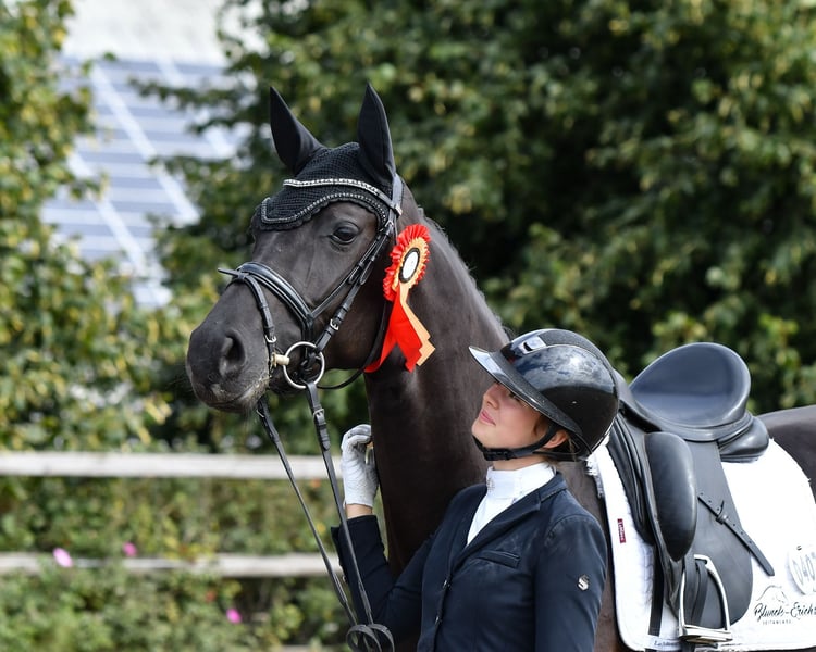 The jet-black Hanoverian mare Freya by Filou-Fürst Nymphenburg impresses not only with her modern appearance and striking looks but also with her excellent rideability and quality. She recently made her debut in a dressage competition and immediately achieved a placing. Her three basic gaits are also worth highlighting, all consistently scoring around 8.0. Freya possesses everything one would wish for a promising career in the show ring. If you are looking for a talented sport partner with potential and want to start the upcoming season at the first competition, this talented mare is the perfect choice. For more information, please contact Luisa Erichsen directly at +49 174 2491719 (also available via WhatsApp).