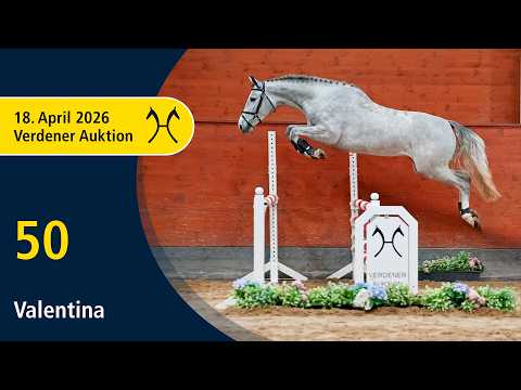 Das Pferd ist ein Verdener Auktionspferd und wird am 18.04.2026 onlive versteigert. Vom 6.04. bis zum 18.04. kann das Pferd jeden Tag beim öffentlichen Training besichtigt und ausprobiert werden. Das Startgebot bei der Versteigerung ist 8.000 Euro. Sehr sympathische Springkandidatin mit bester Blutführung. Am Beginn der Parcoursausbildung stehend, meistert Valentina die Aufgaben spielerisch. Ihre Halbschwester Haiti v. High Level gehörte zu den begehrtesten Springpferden der Elite-Auktion 2025. Die Großmutter HannPr Stella brachte den S-Springen erfolgreichen DJ K v. Diacontinus, eines der Spitzenpferde der Elite-Auktion 2029. Die Mutterlinie wird angeführt von Silver Star v. Stolzenberg (SPR: 1,40 m mit Bernd Herbert, VA 2010) und Royal Lady v. Royal Blend (SPR: 1,30 m mit Alina Hertwig, VA 2011). Zuchtname: Valentina 1. Generation Auktionspferde: HannPrA Vet+ Haiti v. High Level (VA 2025). 2. Generation Sportpferde Springen: DJ K v. Diacontinus (SPR: 1,40 m mit Enrico Süßenbach,VA 2019: 97.000 €). Bes. Prämientöchter: HannPr Baloutina v. Balou Peggio. 3. Generation Sportpferde Springen: Silver Star 30 v. Stolzenberg (SPR: 1,40 m mit Bernd Herbert,VA 2010: 60.000 €); Royal Lady/Royal Lady 36 v. Royal Blend (SPR: 1,30 m mit Alina Hertwig,VA 2011). Auktionspferde: HannPrA Scarlett II/Scarlett v. Stolzenberg (VA 2019); Lady Top v. Laptop (VA 2007). Bes. Prämientöchter: HannPr Stella v. Stolzenberg. 4. Generation Sportpferde Springen: Cäsar v. Calypso II (SPR: 1,40 m mit Bormann,Heinrich); Geronia/Geronia 2 v. Graf Grannus (SPR: 1,30 m mit Finja Bormann). 5. Generation Sportpferde Springen: Werteste/Wanessa 85 v. Werther (SPR: S mit Bormann,Franz Jun.). Mutter: Baloutina Prämierung: 1xIa. ZL: 2/2 ZSP: Feldprüfung Reitpferd - Trab 6,50 Galopp 7,00 Schritt 7,00 / Durchschnitt Rittigkeit 8,25 / Durchschnitt Springen 8,50 Großmutter: Stella Prämierung: 1xIa. ZL: 2/2 ZSP: Feldprüfung Reitpferd - Trab 7,50 Galopp 8,00 Schritt 7,50 / Durchschnitt Rittigkeit 8,00 / Durchschnitt Springen 8,50