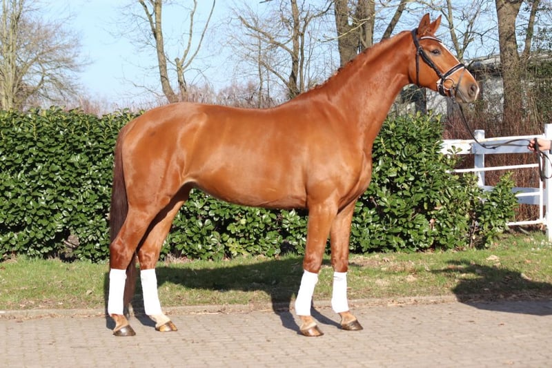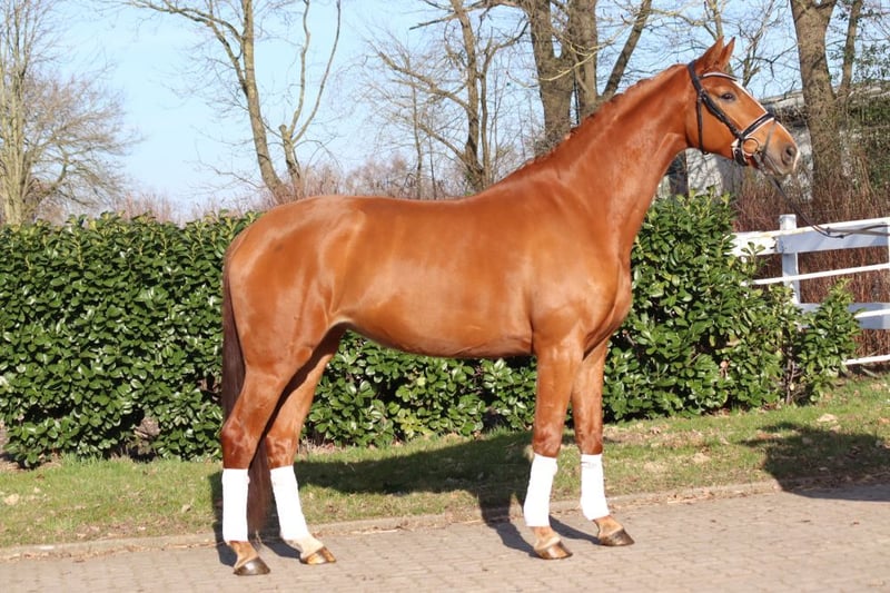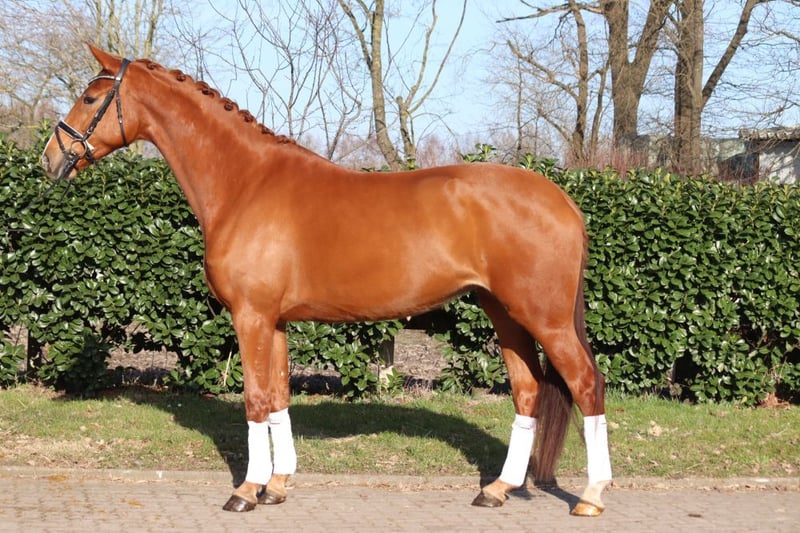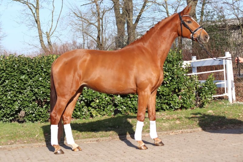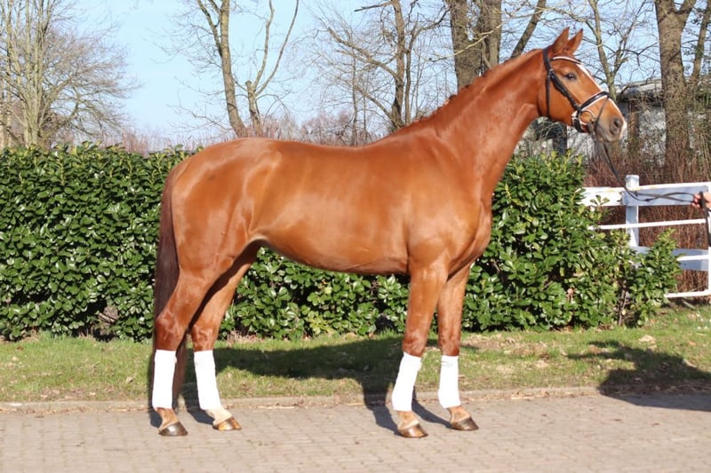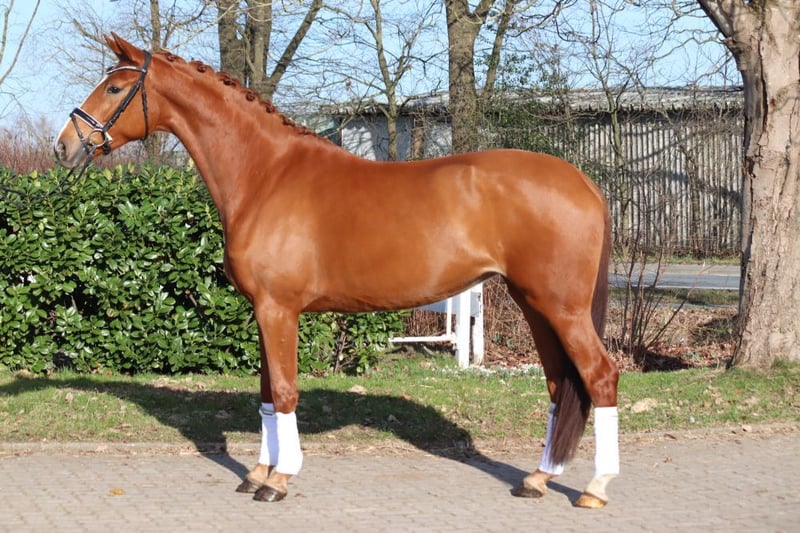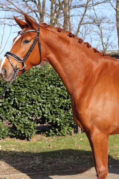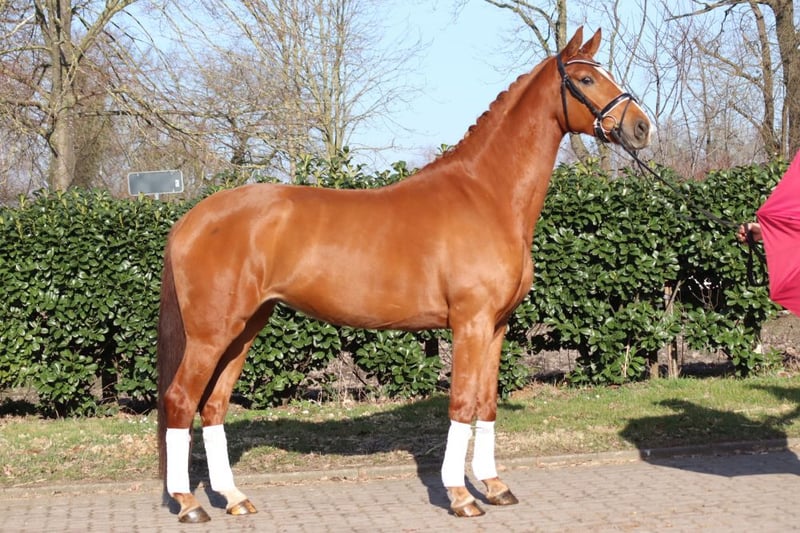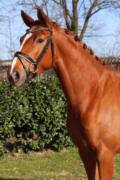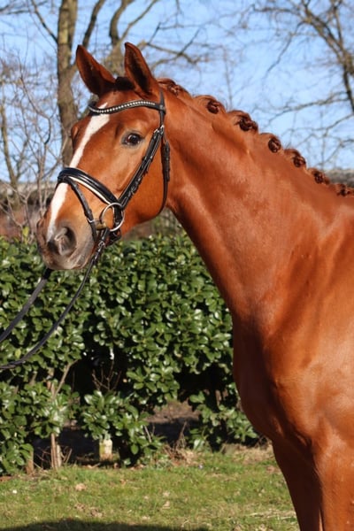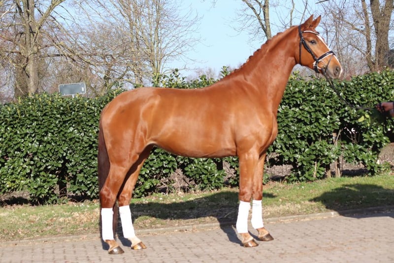 A strikingly typey and charming State Premium mare awarded the highest 1a premium, with a well-completed mare performance test and excellent movement in all three basic gaits. She grew up in her breeder's herd alongside her colleagues. She has been introduced to riding and has been appropriately promoted and trained for her age. Dyna Rose was already "a sweetheart of a foal" from the beginning! Today, she presents herself with very pleasant rideability and is very friendly in handling. Directly from the breeder.