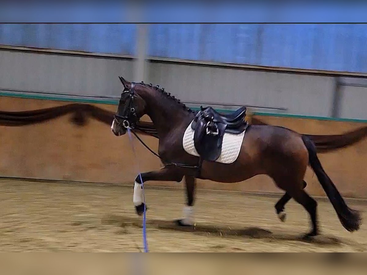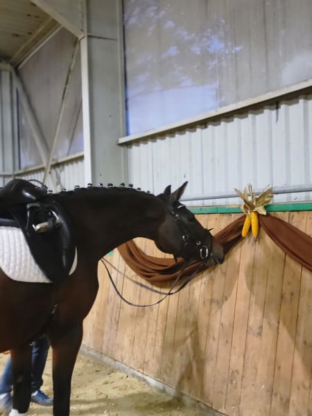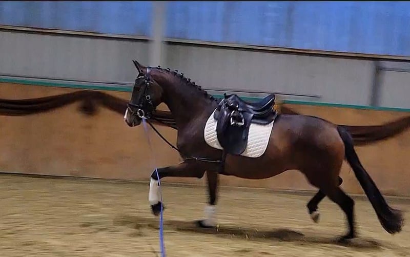 Zum Verkauf steht eine 2021 geborene braune Stute mit qualitätsvollen GGA. Mit einer Größe von im Moment ca. 1,64 cm ist sie ideal für Damen und Amateurreiter*innen geeignet. Die Stute stammt direkt aus unserer Zucht. Ihr Vater ist So Perfect, die Mutter ist von United. Sie befindet sich noch am Anfang ihrer Ausbildung. Trotzdem zeigt sie sich brav, leichtrittig, lernwillig und engagiert. Sie geht alleine oder in kleiner Gruppe mit mir ins Gelände, kennt Handarbeit und vom Boden gearbeitete Trailkurse, diese sind für sie kein Problem, auch beim Freispringen hat sie viel Spaß und Talent. Es steht ihr nun mit dem richtigen Reiter oder der richtigen Reiterin einer Karriere als erfolgreiches Sportpferd nichts mehr im Wege. Sie kennt Schmied und fährt problemlos im Anhänger. Sie war bei uns bisher nie lahm oder krank! Ihr Halbbruder hat sich 2023 und 2024 für das Bundeschampionat in Warendorf qualifiziert und kann Seriensiege in Dressurpferdeprüfungen der Kl. L und M aufweisen. 2025 Kl. M siegreich und Kl. S platziert. Eine tolle Gelegenheit für alle, die ein talentiertes Pferd für den Dressursport oder Vielseitigkeitssport suchen. Aufgrund ihres Alters und des Ausbildungsstandes kein reines Anfängerpferd! Die Beschreibung des Pferdes beruht auf subjektiven Eindrücken und Erfahrungen unsererseits und ist keine Beschaffenheitsvereinbarung und Zusicherung von Eigenschaften. Probereiten erfolgt auf eigene Gefahr.