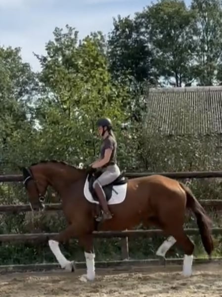 À vendre Jument de dressage absolument chic de 5 ans, fille de Bon. Courage x Totilas Elle possède 3 très bonnes allures et une très belle ligne de profil avec une excellente présence dans le carré. Elle est incroyablement agréable à monter, car elle est très confortable, possède beaucoup de qualité de monte et offre au cavalier une sensation de conduite exceptionnelle. La jument est principalement montée à l'extérieur, car il n'y a pas de manège, mais elle connaît également l'entraînement en manèges. Elle a déjà brillamment réussi de petites promenades en terrain varié. Celui qui recherche un cheval de dressage chic et de qualité trouvera ici son bonheur.