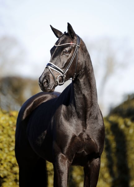 Yegua de doma negra como la noche, con cuatro calcetas blancas y un corazón dorado. Un caballo de cría de alta calidad, muy noble y completamente valiente, que se maneja y trabaja de manera muy sencilla. Hasta ahora ha sido poco promovido y solo en actividades de ocio, aunque posee un potencial claramente superior. Un caballo de doma compacto, sin uso previo, que encanta y alegra a diario. Con un certificado de inspección muy reciente y en perfectas condiciones.