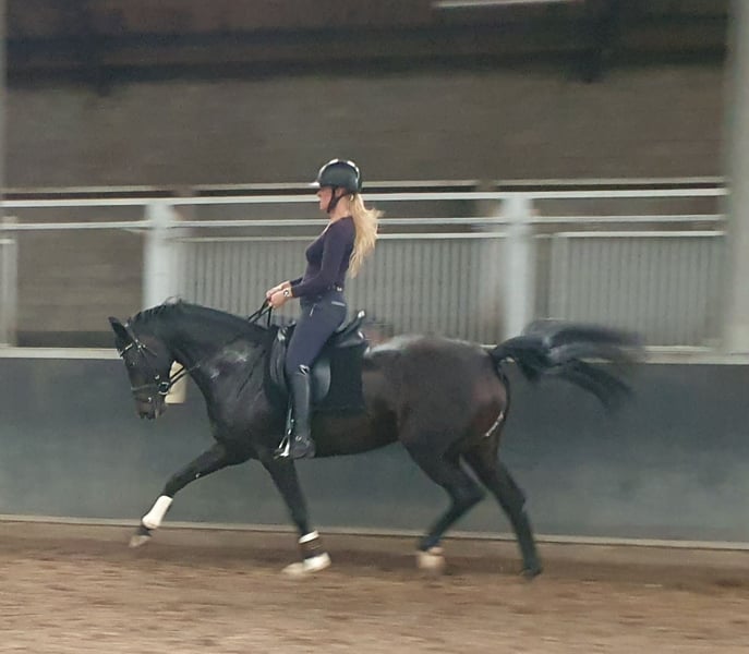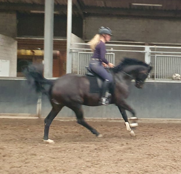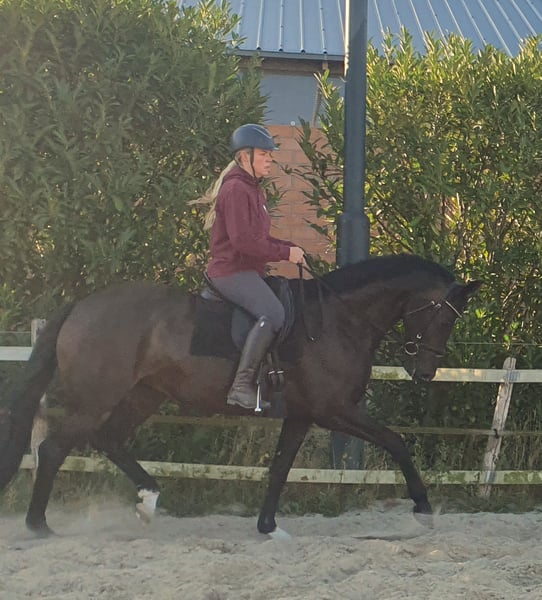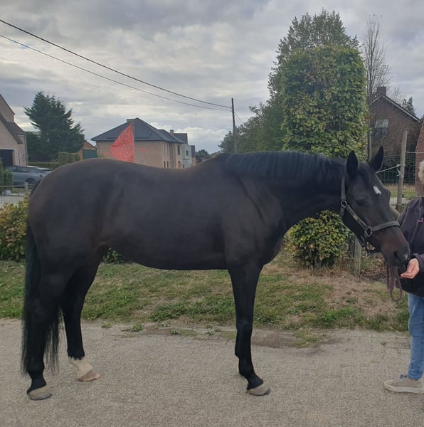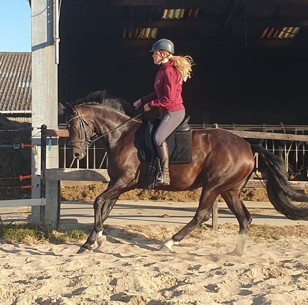 6jr merrie met veel potentieel aangeboden. Ze is bij ons geboren, dus het hele verhaal is bekend. Ze is als 4jr zadelmak gemaakt en zeer rustig aan getraind. Nu klaar om volop in het werk te gaan. Ze heeft een goede stap, een zeer ritmische draf en groot gesprongen galop. Ze heeft een zachte mond en is soepel in haar lijf. Ze is voorwaarts zonder onder je uit te lopen. Ze is nog relatief onervaren, hierdoor niet aangeraden voor beginneling of onzekere ruiter. In omgang is ze heef lief, kan met andere paarden. Geen stalgebreken. Herkeuring kosten koper. Klinisch goedgekeurd op 16/09/2025