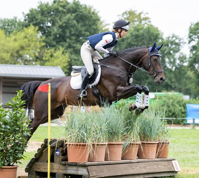 "Glücksmaria" is a Thoroughbred-influenced Hanoverian mare, born in 2020. She demonstrates plenty of "go" across terrain, is well-handled, yet always eager for the next jump. Glücksmaria is a fine ride in all three disciplines. She is also an interesting prospect for the advanced competition level. She already has several placings in cross-country and show jumping events and qualified for the 2025 Bundeschampionat, which she concluded with a victory in the small final. For more information, please contact +49 1523 3869069. Additional versatile eventing horses can be found at www.event-horses.com