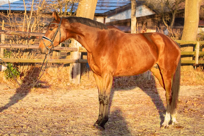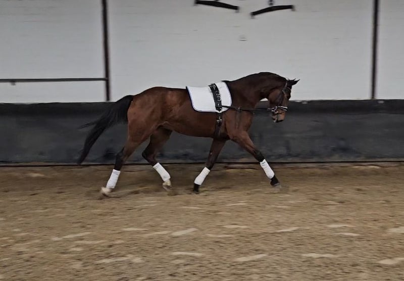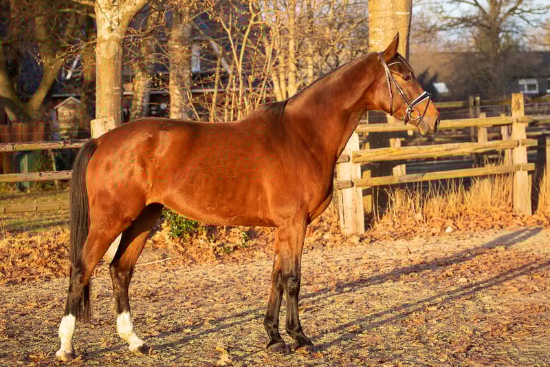 "Flavia" is a beautiful bay Hanoverian mare, born in 2020. Standing at an impressive 17.6 hands, she combines size, elegance, and strength. She is ideally suited for dressage and has shown herself to be talented and eager to perform. Having had two foals, she has been gently backed since autumn. A horse with great potential is waiting for a dedicated rider!