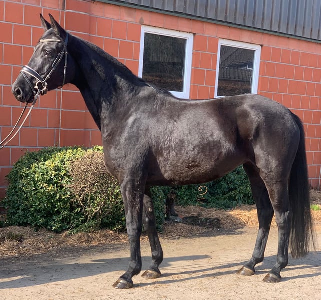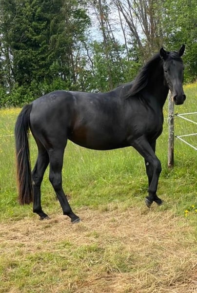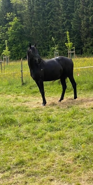 Zum Verkauf steht eine beeindruckende 6-jährige Rappstute von Fürst Samarant x Natiello xx – Weltmeyer. Diese talentierte Stute überzeugt insbesondere durch ihre Schulterfreiheit, ein energisches Abfußen sowie einen überragenden, raumgreifenden Schritt. Ihr stets aktives Hinterbein unterstreicht die hohe Qualität ihrer Grundgangarten und macht sie zu einem vielversprechenden Nachwuchspferd für den Dressursport. Neben ihren sportlichen Qualitäten besticht sie durch ein besonders freundliches und menschenbezogenes Wesen. Ihr ausgeglichenes Interieur macht sie zu einem angenehmen Partner in der täglichen Arbeit. Die Stute befindet sich aktuell in Ausbildung/Beritt und zeigt sich dabei lernwillig und motiviert. Sie stammt direkt vom Züchter, wobei großen Wert auf eine altersgerechte Ausbildung gelegt wurde – angeritten wurde sie erst nach Vollendung des 5. Lebensjahres. Ein 1er Röntgen-TÜV ohne Befunde liegt vor.