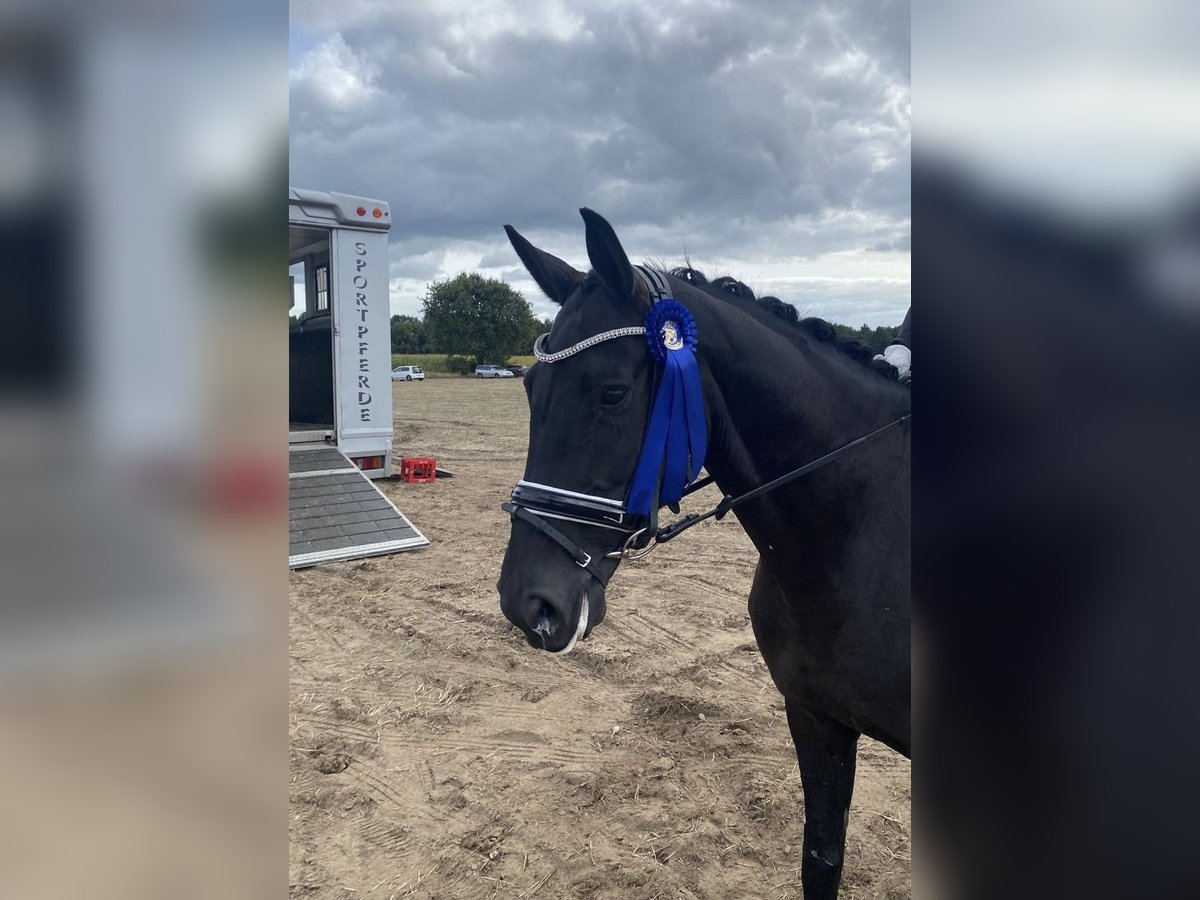 Deborah is a charming 5-year-old mare with excellent basic gaits and lots of potential. She comes from our own breeding program, was carefully broken in and trained with care, has not experienced anything bad in her life and follows her rider willingly and full of trust. She is worked indoors and outdoors, is easy to ride in the field, was able to convince at her first show at the first attempt and was placed at novice dressage level. She has presented herself without fear or nervousness, loading is completely problem-free. X-rays available. If you are interested, please contact me by phone or WhatsApp 0170-9316952