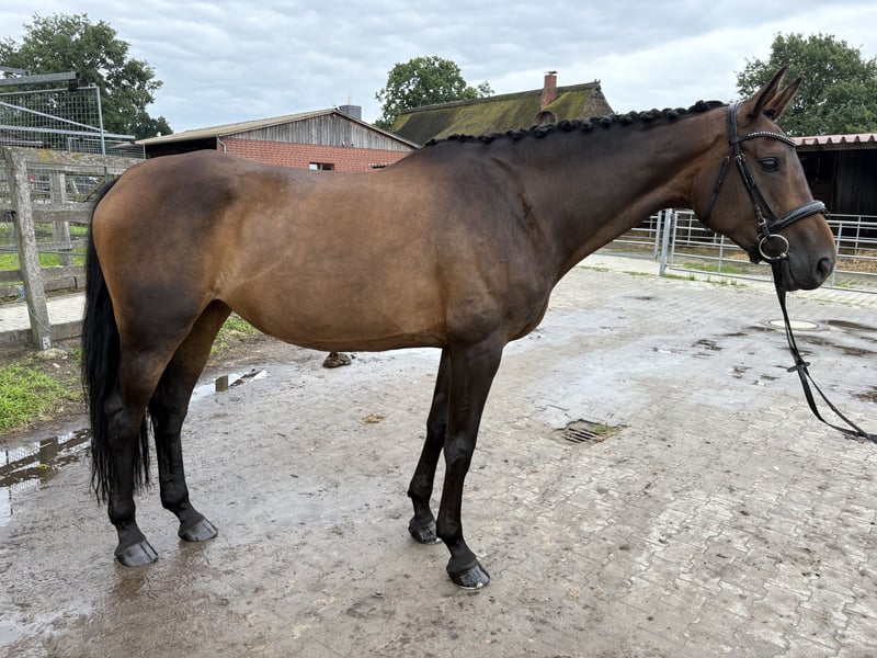 For sale is a 7-year-old mare by Borsalino out of a Weltmeyer mother directly from the breeder. Baroness is approximately 169 cm tall and shines in a bay coat. She was registered in the studbook during the mare performance test at the age of 4. In 2023 and 2024, she had a foal each year and has been gently started under saddle since October 2024. She is loading well, behaves nicely for the farrier, and is familiar with tractors, children, and dogs. She is a horse with an honest character and always wants to please people. Whether in the dressage arena, with cavalettis, or in groundwork, she shows herself to be attentive and willing to perform. However, the mare is not suitable for beginners, as she requires a balanced and confident rider who can continue to support her in muscle development and basic training. For more information and videos, please feel free to inquire. Best regards, Anna