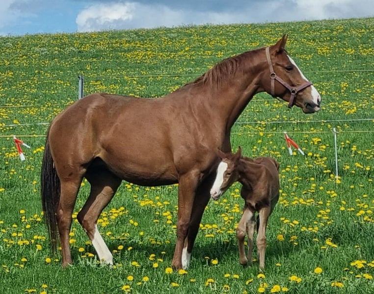For sale due to breeding duties: Beautiful chestnut mare by BENICIO x WATERFORD, standing 16.1 hh, with a foal by ESCANTO PS born in May 2025. Ridden up to E/A level, also capable of jumping well. Currently not in training as she is still in foal and under foot. Training by an S-level rider, passed the SLP exam, but has only been ridden sporadically since then. Full sister of the dam is a successful dressage S-level competitor! A brave, very friendly, and people-oriented mare, also very easy to handle with her foal. Lineage of SCHLIESSERIN, one of the top Hannoverian mare lines! No known health issues or vices. Has been in my possession since foalhood. Raised in an open stable environment, but also accustomed to stabling at night and turnout during the day. She was lightly backed at 4.5 years old due to lack of rider, then started under saddle at age 5 in a training program. She has shown no problems. A veterinary examination (AKU) can be arranged at the buyer’s expense. She has had two foals, both sired by ESCANTO PS, born in 2023 and 2025. Not bred for 2026; the 2025 foal has already been sold and will be weaned in mid-November. Additional riding videos available. Please feel free to contact me with any questions.