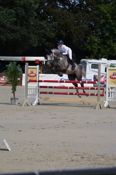 A stunning Hanoverian mare born in 2017 is for sale. She impresses every day with her great willingness to perform and her lovable character. Her calm and affectionate nature makes her very easy to handle. She rides calmly in the field and is always well-behaved when traveling in the truck or at the blacksmith. In the show jumping arena, she displays a lot of ambition and power, so she is not suitable as a beginner’s or children's horse. She is a 7-year-old, having achieved M** placings and competed successfully at S level. Unfortunately, I haven't been able to ride her much this year due to lack of time, so at 8 years old, she has only competed very sparingly. With a heavy heart, I am offering her for sale because I can no longer dedicate enough time to her due to my professional commitments. X-ray images from March 2023 and August 2024 are available. Please feel free to contact me if interested. Viewings and trial rides are possible by appointment (Location: Göttingen). Phone: 0172/2963401