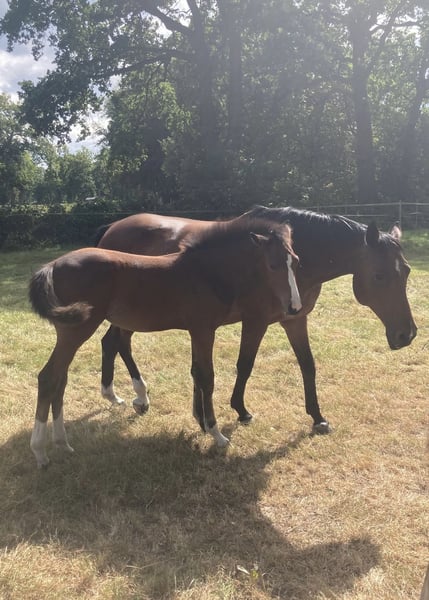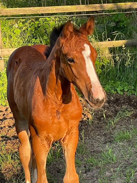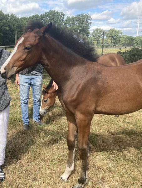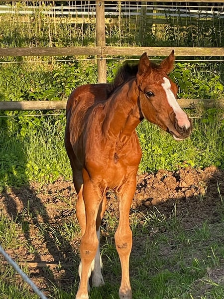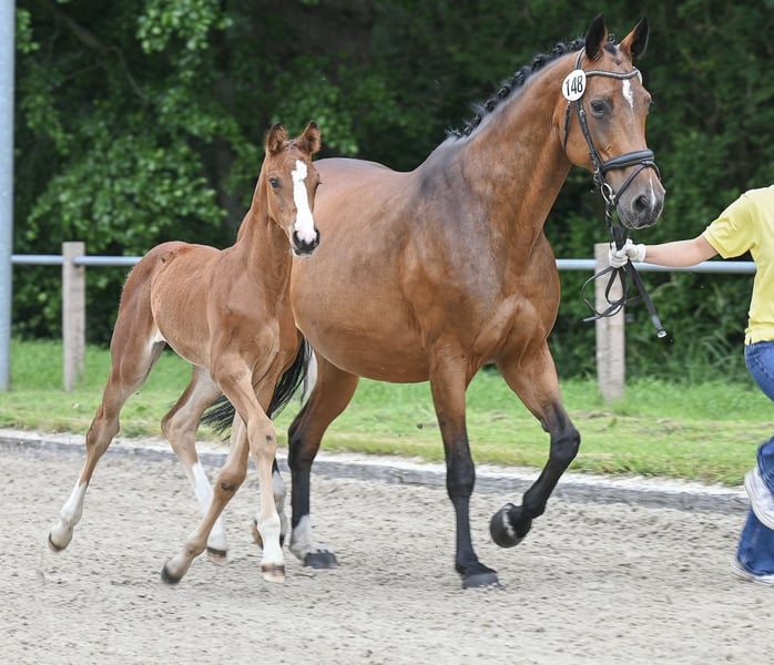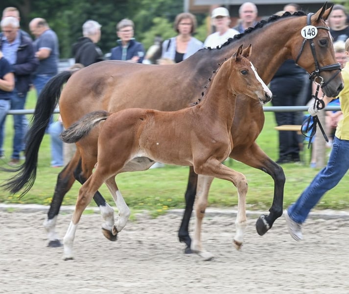 Hannoveraner Stutfohlen mit sehr viel Qualität und Potential für Dressur, Springen und Vielseitigkeit. Preis VB zzgl. Mehrwertsteuer Dieses edle Hannoveraner Stutfohlen vereint moderne Typausprägung, Leistungsbereitschaft, Vermögen und ein wunderbares Interieur. Abstammend von Vidar, doppelt veranlagter Celler Landbeschäler, der großrahmig und mit gutem Talent am Sprung eine lückenlose Karriere als Dressurpferd bis zum Grand Prix vorweisen kann. Seine Abstammungstafel baut auf vornehmlich springbetonten Vorfahren auf, bei deren Selektion auf gute Grundgangarten und unkomplizierte Reiteigenschaften Wert gelegt wurde. Vater Viscount vererbt Rittigkeit und Leistungsbereitschaft und kann über 350 eingetragene Sportpferde vorweisen. Vidar, der für Rittigkeit, Vermögen und Ausstrahlung steht, selbst bis S*** erfolgreich in der Dressur unterwegs ist und über Viscount, Contendro und Edward beste beidseitige Veranlagung mitbringt, wurde hier mit einer holsteinisch geprägten Stute angepaart, die über Quintender x Clinton I genetisch im Springsport den höchsten Ansprüchen gerecht wird. Charakter & Auftreten: Dieses Fohlen zeigt sich aufmerksam, lernfreudig und absolut menschenbezogen. Sie ist bereits total brav beim Schmied und hat beim ersten Mal ohne Zögern die Hufe gegeben – ein echtes Verlasspferd in der Entstehung, das bei uns täglich an der Hand unterwegs ist. Bewegung & Veranlagung: Mit ihrer ausdrucksstarken, bergauf gesprungenen Galoppade, dem kraftvollen Hinterbein und viel Elastizität zeigt sie großes Potenzial für alle Sparten des Sports. Dazu kommt ihre Vielseitigkeit in der Abstammung – beste Voraussetzungen für eine erfolgreiche sportliche Zukunft oder den züchterischen Einsatz. Besonderheiten: • Langbeinig, elegant, mit modernem Typ • Vorsichtig und leistungsbereit • Beidseitige Veranlagung genetisch abgesichert • Springvermögen • Lieb im Umgang und sehr kooperativ • Überdurchschnittliche Grundgangarten, tolle Schwebephase im Trab, große Galoppade mit ausgeprägter Bergauftendenz Unsere Vinnie könnte, wenn alles passt, im Dezember umziehen. Wir freuen uns auf Anschreiben von netten Menschen, die unserem Fohlen ein förderndes Zuhause bieten möchten.