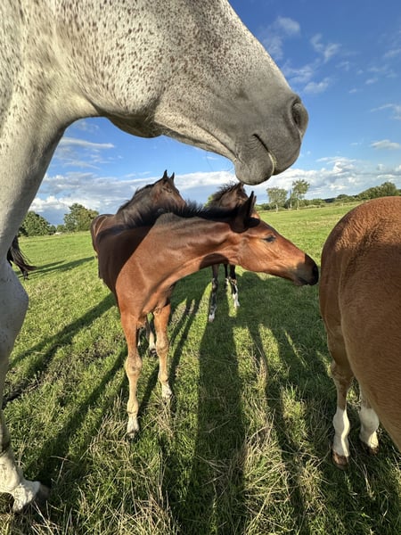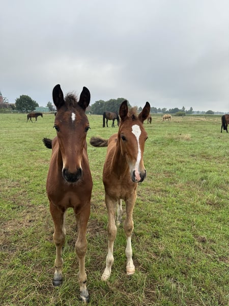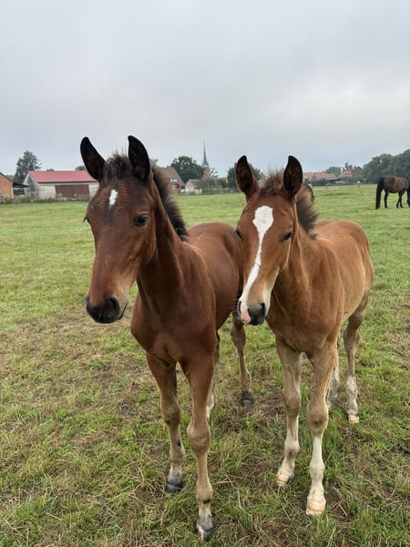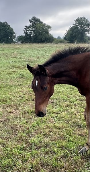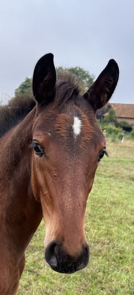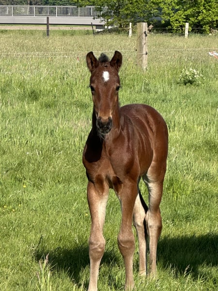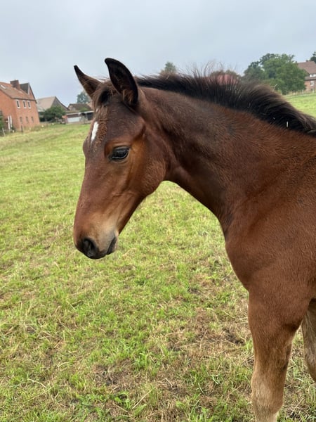 Very typy, large-framed foal with a stallion-like appearance. The dam line has already produced several successful show jumpers up to S*** level (including participation in the World Cup Final in Riyadh 2024 and participation in European Championships in eventing, etc.). The sire is Chicago Blue VDL by Chacco Blue x Cento x Chin Chin: Chacco Blue, already a legend, made headlines in sport with his 3rd place finish in the Grand Prix of Aachen. The son of Chambertin has proven himself on the international stage. The dam, Cella, topped the WBFSH list of the world's most successful show jumpers in 2013. In addition to numerous Grand Prix wins under Ben Maher, the Vice European Champion title is one of the outstanding achievements of this pair. The victory in the Preis von Europa in Aachen was also one of the highlights of her career. Ben Maher describes his Cella as "a true fighter who was unbeatable when in good spirits." The maternal grandsire, Dobel's Cento by Capitol I, is one of the most famous heroes of German show jumping, having won the Grand Prix of Aachen in 2000 under Otto Becker and achieving European Champion and Olympic Champion titles with the German team. The grandmother of Chicago Blue is also a celebrity, Usha van't Roosakker. The mare, successful in 1.50m show jumping under Marlon Modolo Zanotelli, is the founding mare of the highly sought-after "Roosakker" lineage worldwide.