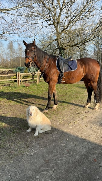 Omdat onze rij-activiteiten zijn veranderd, zoeken we nu een nieuwe uitdaging voor onze zachte reus. Hij is dressuurmatig opgeleid tot M, dus hij is een geweldige partner voor een recreatieve dressuurruiter. Hij houdt echter ook van grondwerk. Hij is altijd lief en braaf, zelfs als je niet regelmatig kunt rijden, kun je zonder longeren weer opstappen. In het terrein is hij normaal gesproken snel, maar ook hier is hij vriendelijk, zachtaardig en altijd goed te controleren. We kunnen ons voorstellen dat terugkerende ruiters die weer plezier willen krijgen in recreatieve dressuur en ontspannen buitenritten, interesse hebben, maar ook beginners of overstappers die onder begeleiding van een trainer willen leren. We zouden het fijn vinden als hij weer een nieuwe taak krijgt, want hij houdt van de tijd met mensen. Indien gewenst, kan ook wat toebehoren meegeleverd worden. Video op aanvraag.
