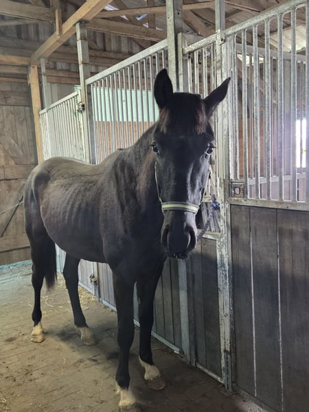 Biete hier im Auftrag einen 2 jährigen Hannoveraner Wallach an. Er ist sehr menschenbezogen, er möchte am liebsten immer betüdelt und gekrault werden er ist im Umgang wirklich ein Schatz ist auch an neuen Dingen immer sehr interessiert. Lässt sich anbinden, putzen und Hufe geben ist kein Problem für ihn, ist geimpft und entwurmt und die Zähne wurden gemacht. Er kommt momentan Nachts in die Box und tagsüber im Offenstall mit anliegenden Paddock. Hufe werden demnächst wieder gemacht. Er stammt ab von Fanegro/ Dancier und ist geboren am 3.3.24 ist ein Rappe mit 4 weissen Fesseln und wird um die 170 cm groß. Er wird sicherlich ein toller Freizeitpartner. Wegen eines Schönheitsfehler unter dem Wert zuverkaufen (Übergebiss). Bilder sind ganz Aktuell