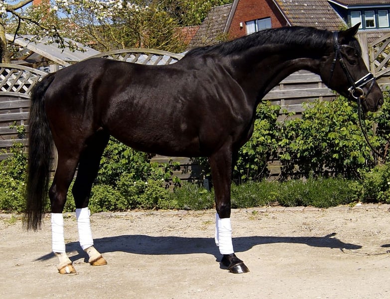 Wegen Bestandsverkleinerung sucht dieser talentierte Wallach einen neuen Besitzer. Direkt vom Züchter. Alter 3 Jahre, Farbe Rappe, roh. Hamilton verfügt über 3 sehr gute Grundgandarten mit einem unerschütterlichem Takt. Er ist dressurmäßig gezogen, zeigt aber auch Talent fürs Springen. Deshalb kann ich ihn mir auch gut in der Vielseitigkeit vorstellen. Die Mutter (mit Vollblutanteil) ist sehr rittig und mit guten Grundgangarten ausgestattet und ebenfalls talentiert am Sprung. Sie hat ein Stockmaß von 1,70 m. Die letzten 2 Fotos zeigen die Mutterstute im Alter von 4 Jahren. Sie ist die Halbschwester von Albi Pedrams Hidalgo (S-Dressur erfolgreich) - beide stammen aus der gleichen Mutterstute. Der Vater von Hamilton ist Helium (Stockmaß 1,72 m ) - ein sehr erfolgreicher Trakehner Hengst, der auch auf S-Niveau unterwegs ist. Ein 4-jähriger Vollbruder kann ebenfalls besichtigt werden. Er ist schon angeritten und zeigt sich unter dem Sattel absolut unkompliziert, sehr rittig mit ebenfalls sehr guten und besonders schwungvollen Gangarten und Springtalent. Eine Ankaufsuntersuchung wurde bisher, da er bei uns geboren wurde, noch nicht gemacht. In den 3 Jahren war er nie krank oder lahm. Hamilton ist mit einer Gruppe gleichaltriger Wallache aufgewachsen. Er ist eher rangniedrig und zettelt keinen Streit an. Hamilton steht noch bis zum Frühjahr in der Herde und soll dann eingeritten werden. Der Verkaufspreis wird dann entsprechend angepaßt. Ein früheres Einreiten wäre ebenso möglich. Wenn ihr Interesse habt, meldet euch gern per Whats app 0172 1857496. Liebe Grüße