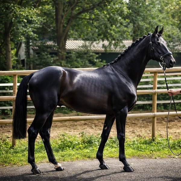 For sale is a dark bay stallion by For Real out of Quantensprung. He was approved for licensing but was not licensed. He is now backed and riding. He demonstrates a very good jump in free jumping, which suggests he could also be suitable for eventing. A very good X-ray TÜV is available. He is familiar with trailer loading, has been extensively lunged, and is already confident handling. Feel free to arrange a viewing appointment, preferably via WhatsApp at +49 157 36343268.