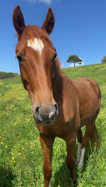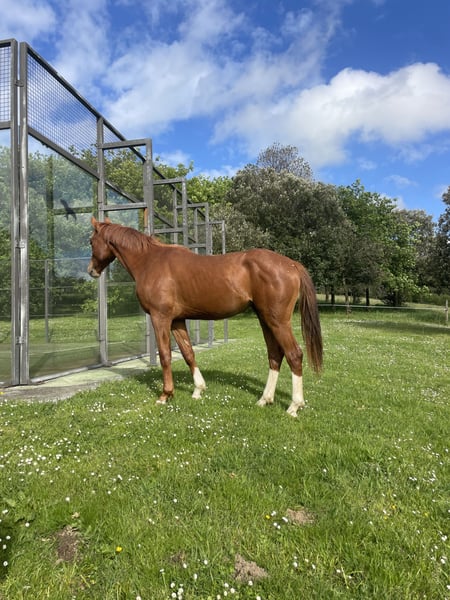 Podolski is een prachtige ruin die net 3 jaar is geworden. We hebben hem als veulen gekocht en hij is uitgegroeid tot een vriendelijk, zachtaardig paard. Zijn vader is Perigueux, die op 1,60 m is gesprongen en in 2013 de Grande Prijs van Hannover Verband ontving. Hij heeft 12 gekeurde hengsten en 12 nakomelingen die op 1,60 m niveau uitkomen, met veel meer die boven de 1,40 m uitkomen. Podolski heeft zoveel potentieel en is een heel lief, knap jong paard.