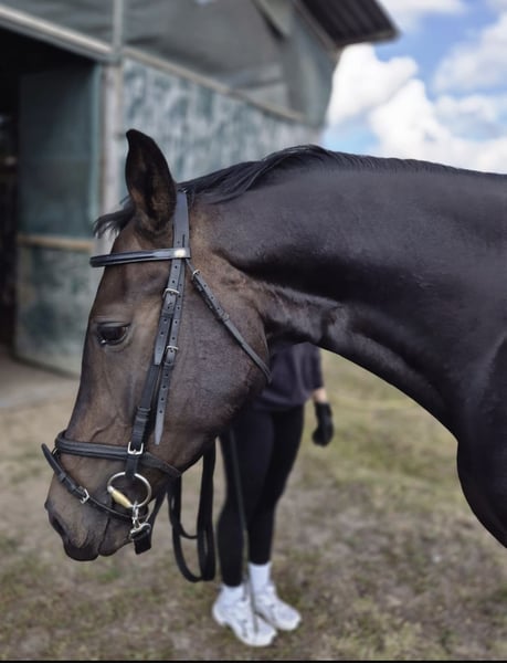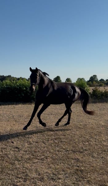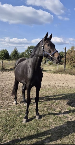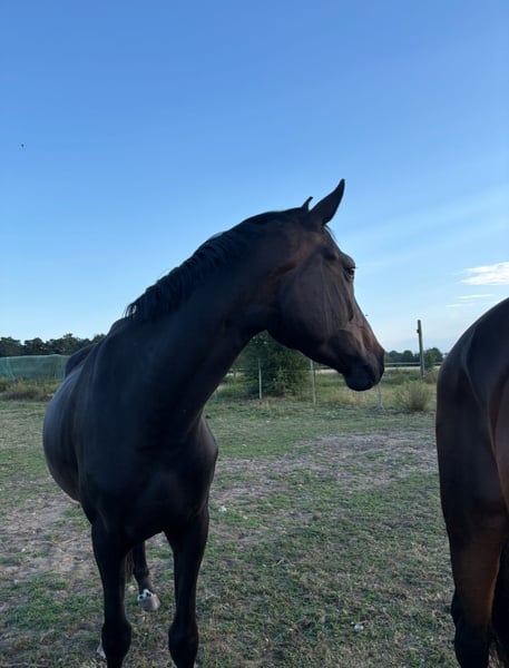 I am offering my four-year-old gelding Valentino for sale. Valli is a stunning, dark bay young horse sired by the show jumping stallion Viscount. His talent for jumping is already clearly evident in free jumping: he is brave, powerful, careful over jumps, and shows great enthusiasm for the task. He has not yet been backed but is familiar with groundwork and demonstrates attentiveness, motivation, and curiosity during these sessions. Valli learns quickly and responds delicately to signals. When he gets startled, he quickly regains trust and explores his surroundings with interest. Currently, he lives in a herd with up to three other horses. He is social but tends to be somewhat dominant. He is a loyal partner but requires a confident, experienced, and consistent handler who can provide him with security and structure. He is not suitable for beginners, as he needs clear yet fair leadership. I have grown very fond of Valli but am reluctantly offering him for sale because I can no longer meet his needs due to my A-levels and upcoming university studies. My wish is for him to find a home where he will be nurtured and loved – by people who appreciate his wonderful nature and potential.