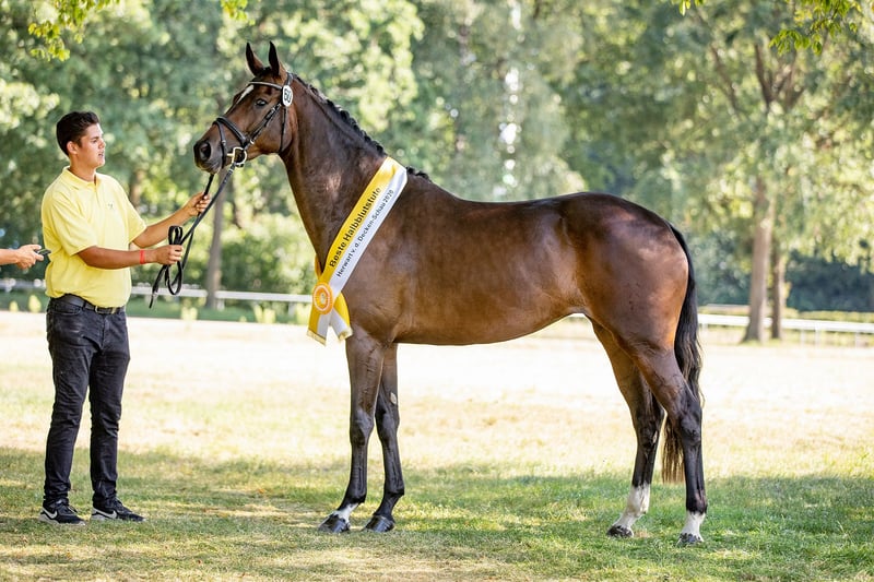 Vierjarige Hannoveraanse ruin uit onze fokkerij met uitstekende afstamming: BAILADORINHO CE (Bert) Vader: BAILADOR (Benicio x Florencio I) Moeder: Hannoveraanse Prämienstute IXXI CE (IL DIVO x DON FREDERICO x WELTMEYER), BESTE HALF BLOOD merrie 2020 op de Herwart von der Decken-show, ook met zeer goede SLP Geboortedatum: 12 mei 2022 Maat: 1,68 m Opmerking: Röntgen TÜV inclusief hals en rug beschikbaar. Berti is in professionele opfok grootgebracht met diervriendelijke verzorging, is regelmatig gevaccineerd, ontwormd en voorgesteld aan de hoefsmid. Hij is zeer mensgericht en klaar voor een leeftijdsadequate opleiding. Omdat hij nog in de opfok staat, is er helaas geen recent, representatief filmpje dat recht doet aan zijn kwaliteit.