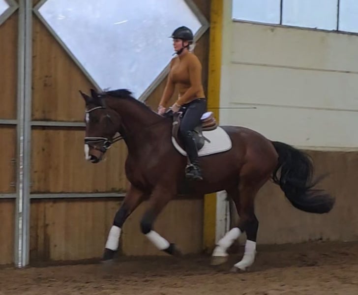 Tarok ist ein hübscher und ausgesprochen lieber Partner für Dressur, Freizeit und mehr. Für sein Alter ist er unglaublich cool und unerschrocken. Tarok hat eine sehr gute Dressurabstammung und durchaus tolle Bewegungen. Er lässt sich leicht an den Zügel stellen und vermittelt dem Reiter ein gutes und sehr sicheres Gefühl. Er lässt sich in den 3 Grundgangarten ordentlich reiten, absolviert erste kleine Sprünge unter dem Reiter und geht unerschrocken ins Gelände, sowohl in der Gruppe, als auch allein. Bei weiterer Förderung wäre Tarok sicher auf Turnieren erfolgreich. Aufgrund seines tollen Charakters verspricht er aber auch ein sehr zuverlässiges Freizeitpferd zu werden. Verladen, Hufschmied, Duschen... alles kein Problem. Auch mit anderen Pferden verträgt er sich gut. Er steht hier nachts in der Box und tagsüber in der Wallachgruppe auf dem Paddock. Tarok kennt aber auch reine Weidehaltung und würde sich sicher auch im Offenstall wohlfühlen. Ein Pferd, das einfach ein 5* Zuhause verdient hat. Übrigens lief er gerade super abgeklärt die Dressurquadrille beim Weihnachtsreiten mit Fast 4j Hann Wallach 1.69m Klinische Aku vorhanden Video: https://youtu.be/6LJSjibol3M?si=1GUdZI4462Sh2bhD Noch mehr Fotos, Videos und kleine Einblicke in den Alltag unserer Pferde gibt’s auf Instagram: [maresi_lange]. Schauen Sie gern vorbei und lernen Sie unsere Vierbeiner schon vorab ein bisschen kennen. You can find more photos, videos and little insights into the everyday life of our horses on Instagram: [maresi_lange]. Feel free to take a look and get to know our horses a bit better in advance.“ Weitere Pferde auf meiner Homepage MaresiLange.de oder auf Anfrage. Die Beschreibung des Pferdes beruht auf subjektiven Eindrücken und Erfahrungen unsererseits und ist keine Beschaffenheitsvereinbarung und Zusicherung von Eigenschaften. Probereiten erfolgt auf eigene Gefahr. Verkauf erfolgt im Auftrag. Für das Vorstellen/ Probereiten des Pferdes erlauben wir uns eine Aufwandsentschädigung in Höhe von 30 Euro zu berechnen. Diese wird natürlich bei Kauf des Pferdes verrechnet.