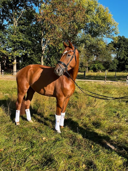 Grzeczny wałach od V- Plus - Le Vivaldi Urodzony w 2021 roku Jest już w treningu, testowany przez dzieci, zawsze grzeczny i bezpieczny Bezpieczny w terenie Nie zna zrzucania, wspinania się itp. Około 175 cm Zdrowy Lekko karpiaty grzbiet, bez ograniczeń do sportu Do sprzedaży z powodu zmniejszenia stanu posiadania.