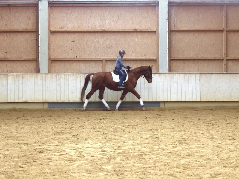 Elegant Hanoverian gelding – ideal for dressage and vaulting We are offering a beautiful chestnut gelding, born in 2022, with excellent lineage. Standing at approximately 177 cm (17.1 hh), he impresses with his impressive size and balanced movement. This Hanoverian is well-suited for dressage and demonstrates great talent and a promising basic training. His friendly nature and pleasant character make him a reliable partner. With appropriate training, we could also see him as an excellent vaulting horse. Please contact us for more information, or to arrange a viewing and test ride. Current video of him under saddle is available. Get in touch to learn more about this promising young horse!