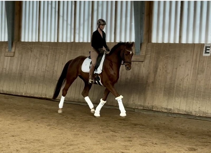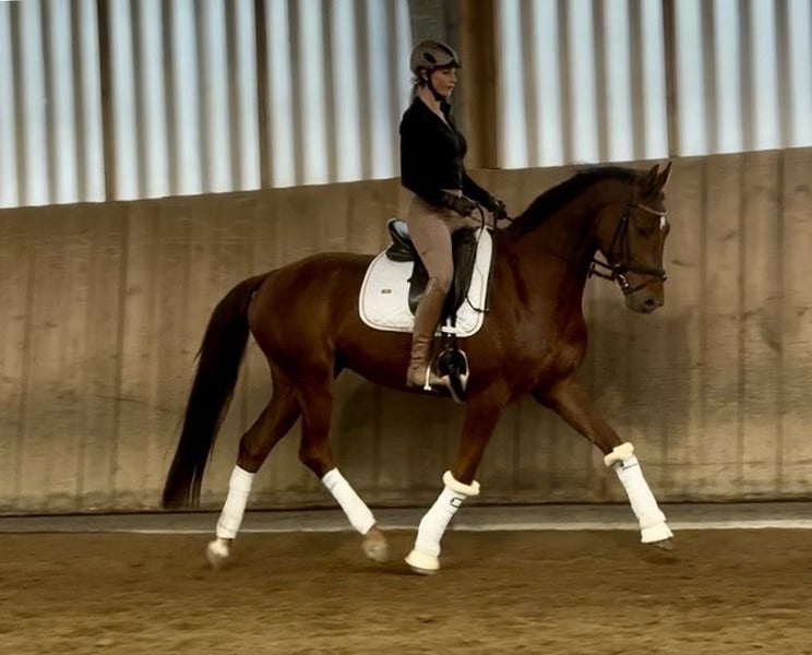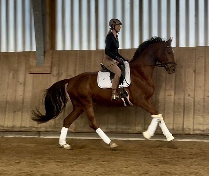 Zum Verkauf steht ein wunderschöner 5 jähriger Dunkelfuchs Wallach. Mit 169cm die ideale Größe für ambitionierte Reiterinnen und Reiter, die einen zuverlässigen Dressurpartner suchen. Der Wallach ist angeritten und zeigt keinerlei Unarten wie Steigen, Buckeln oder Durchgehen Er lernt sehr schnell und möchte stets gefallen. Aktuell noch ohne Eisen kann man trotzdem sein gutes Bewegungspotenzial sehen. Das junge Dressurpferd überzeugt durch sein elegantes Erscheinungsbild und einem angenehmen Temperament. Er zeiget viel Talent und Lernbereitschaft in der Dressurarbeit. Das freundliche Wesen macht diesen auch für weniger erfahrene Reiter interessant. Auch von Jugendlichen zu reiten. (siehe letztes Video) Das Pferde ist gesund und hat Röntgenbilder mit Rücken und Hals ohne jeglichen Befund oder Kommentar. Er wurde regelmäßig geimpft und stammt aus einer guten Zuchtlinie. Nun ist er bereit, die weitere Ausbildung gemeinsam mit einem engagierten Reiter zu absolvieren. Bei Interesse oder für weitere Informationen stehe ich Ihnen gerne zur Verfügung. Besichtigung und Proberitte sind nach Vereinbarung möglich.