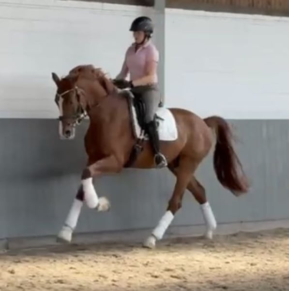 BELLIMORE stands out in many ways. At first glance, he catches the eye with his interesting markings. But he also impresses in terms of movement quality: his walk, trot, and canter are of exceptional quality and can be further promoted and developed. He has a good work ethic, appears somewhat youthful, but is always focused on the rider.