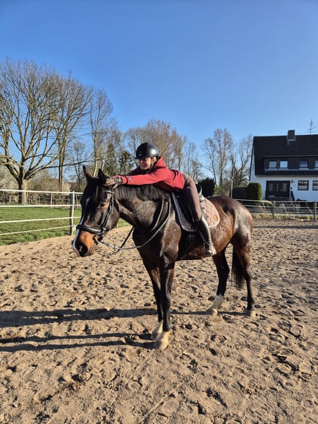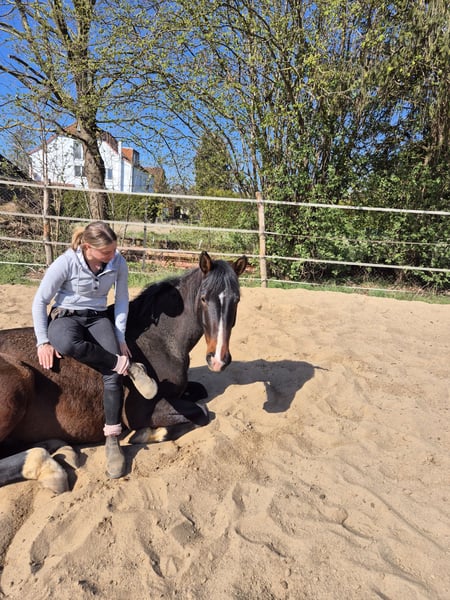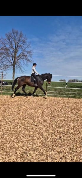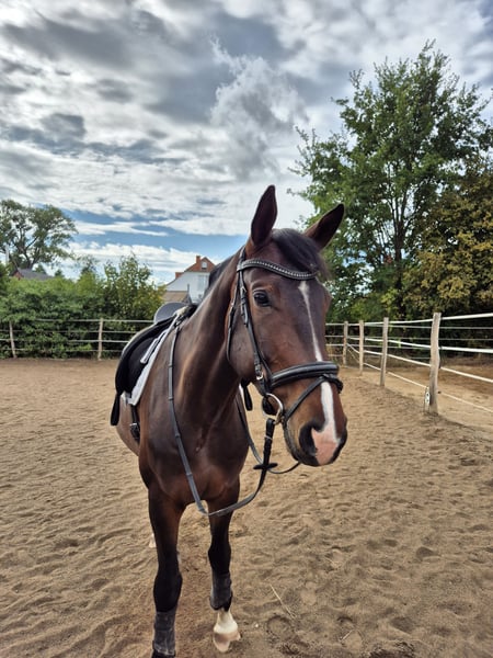 Ich verkaufe aufgrund Bestandsverkleinerung meinen menschenbezogenen, lieben, braunen fünfjährigen Hannoveranerwallach. Ich habe ihn als Fohlen gekauft und bei mir im Offenstall aufgezogen. Er ist den Kontakt zu Kindern und landwirtschaftlichen Maschinen gewöhnt. Harry wurde in diesem Frühjahr, aufgrund seiner Größe erst recht spät, schonend angeritten. Er zeigt sich als sehr lernwillig, leichtrittig und leicht an den Hilfen. Er läuft solide alle 3 GGA. Ihn zeichnet seine hervorragende Arbeitseinstellung aus, an welche auch nach einer längeren Pause ohne jegliches Bocken angeknüpft werden kann. Da er erst seit einem halben Jahr unter dem Sattel ist, ist er kein Anfängerpferd. Mit einem feinen, selbstbewussten Menschen ist er jedoch ein Pferd mit hohem Potenzial für die gehobene Freizeitreiterei. Mit weiterer Routine kann ich ihn mir sehr gut auf Turnieren vorstellen. Er nimmt neue Situationen gut auf, braucht dabei aber jemanden, der ihm Sicherheit gibt. Abstammung: Emilio Sanchez × Don Henrico Größe: 1,78m Ich wünsche mir eine liebevolle Person, die Erfahrung in der weiteren Ausbildung und dem Umgang von Jungpferden hat. Da er auf der Weide geboren wurde und seitdem bei mir im Offenstall steht, wünsche ich mir auch weiterhin eine Paddock- und Weidehaltung für ihn. Bei Interesse gerne bei mir melden. Videos auf Anfrage per WhatsApp möglich. Kein Notverkauf!! Er wird nur verkauft, wenn alles passt. Probereiten ist nach Absprache möglich. Hierfür werden 30€ berechnet, welche jedoch bei einem Kauf angerechnet werden.