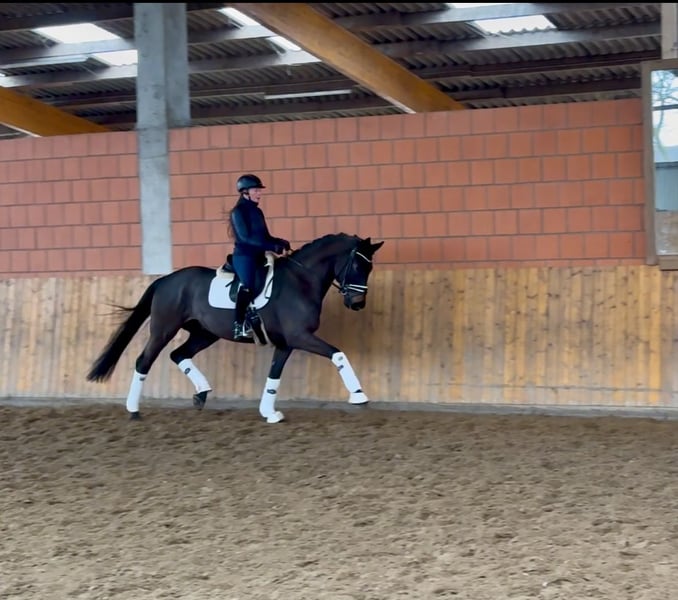 **Sale ad: Elegant Hanoverian gelding** An impressive Hanoverian gelding, born in 2020, is for sale. This noble black bay not only impresses with his elegant appearance, but also with his excellent suitability for dressage. With an impressive height of 175 cm, he attracts everyone's attention and impresses with his ground-covering movements and balanced temperament. This gelding is the ideal partner for ambitious dressage riders looking for a reliable and talented sport partner. He shows great potential for higher tasks and is ready to take the next steps in his career with his new owner. If you are looking for a horse that impresses with both his looks and his abilities in the dressage arena, then this Hanoverian gelding is just the right horse for you.