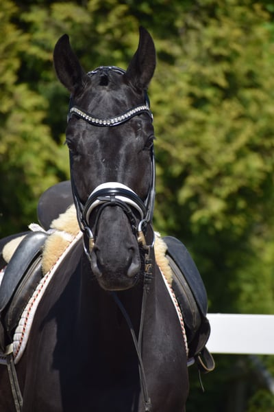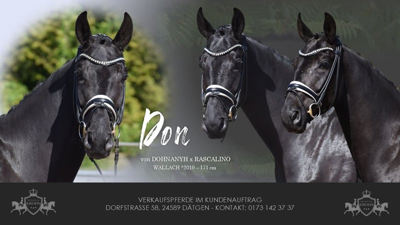 ⚜️⚜️⚜️BEEINDRUCKEND SCHÖNER, RAPPSCHWARZER, LERNWILLIGER, LEICHTRITTIGER, INTELLIGENTER BEWEGUNGSKÜNSTLER FÜRS GROßE VIERECK⚜️⚜️⚜️ Zum Verkauf steht in Vertretung des Besitzers, dieser beeindruckend schöne, 171 cm große, 6-jährige Hannoveraner Rapp Wallach mit bester Dressurabstammung von DOHNANYI x RASCALINO x WARKANT. "DON" ist ein imposanter typstarker Wallach lackschwarzer Jacke, hinten zwei mal Weiß, typvollem Gesicht, einem harmonischen Gebäude und drei herausragenden Grundgangarten. In der Bewegung zeigt sich "DON" als Sportler fürs große Viereck. Mit viel Schwung und Schub ausgestattet, bewegt er sich ausgesprochen Taktvoll mit großzügigen Abläufen. Zudem verfügt er über ein sehr gutes Hinterbein, mit viel Kraft, Lastaufnahme, weit unter den Schwerpunkt fußen und sehr gut gewinkelt. Hieraus erwächst Raumgriff, Schulterfreiheit, Schub, Abdruck und Bergauftendenz. "DON" ist Rittig und gefällig in der Anlehnung. Er möchte gefallen und die reiterlichen Hilfen annehmen und umsetzen, daher ist "DON" auch für JUNIOREN mit jungpferde Erfahrung geeignet. Alles in allem zeigt sich hier ein heranwachsendes S Dressur Nachwuchspferd mit guten Ansätzen für den Grand Prix Sport mit herausragendem Schritt! "DON" befindet seid her im professionellen Beritt und auf sicherem Dressurpferde A Niveau, im Training werden zur Zeit Lektionen des Dressurpferde L Niveaus erarbeitet. Seine Einstellung und sein Ehrgeiz machen aus Ihm einen kooperativen Leistungssportler mit der richtigen Einstellung zum Sport. Gerne kann "DON" nach dem Kauf, bei uns in professionellem Beritt verbleiben. Ein guter und umfangreicher röntgenologischer und klinischer Tüv liegt vor.