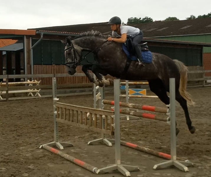 Catch M is a still-growing, sweet but shy gray gelding by Colman from our own breeding. He was started under saddle at the age of 4, but due to his growth, I put him back out to pasture at 5 years old. He first needed to learn how to handle his body. Currently, he stands at 1.75m, but I believe he will continue to grow. As of now, or since last autumn, he has been further trained (L-level courses are no problem, see video). He shows himself to be very rideable and uncomplicated. He is currently kept in a group open stable. His mother was started under saddle after weaning Catch M. She was placed up to S* at the age of 8 and was then sold to France (she had only one foal). Several successful show jumpers up to S*** have already come from the mother line (including participation in the World Cup final in Riyadh 2024). Catch M was X-rayed in January 2022 (18 images), and there were no significant findings. Catch M is already registered as a competition horse and has been regularly vaccinated (+ dewormed, of course).