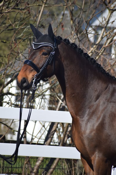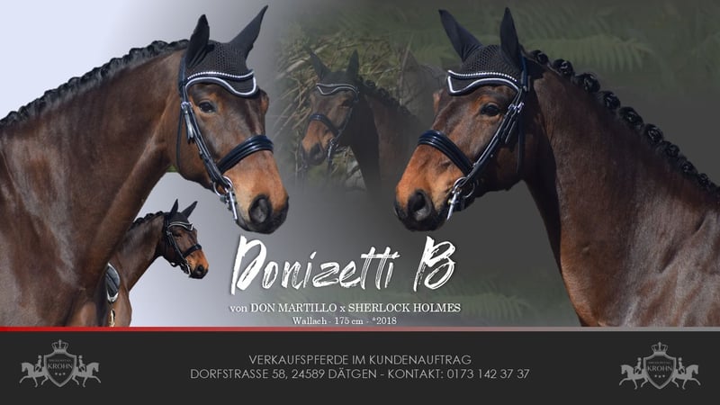 A Reliable Investment and Your Ticket for the FEI Small Tour / S* + S** / PSG + Inter I – Sport-Ready with Great Potential for Grand Prix Level – Suitable for Junior Riders! For sale, on behalf of the owner = breeder, is this impressive, 1.75 m tall, 2018-born (8-year-old) bay Hanoverian gelding by DON MARTILLO x SHERLOCK HOLMES. "Donizetti B" is an exceptional athlete and the perfect combination of power, elegance, and an invaluable character. He is a horse that captivates not only with his presence but also with a flawless competition record. If you are looking for a young horse with proven placings and wins, confidently competing at S-level and with the doors to Grand Prix wide open, this is your chance. SPORTING CAREER: A RECORD FILLED WITH SUCCESS The competitive history of "Donizetti B" is a testament to his quality and consistency. His achievements are thoroughly documented and demonstrate his class at every age: • Young Horse Successes: Placed high in dressage tests for young horses at Class A already at age 4, followed by wins in dressage tests for young horses at Class L as a 5-year-old. Additionally, placed in M-level dressage tests. The Path to the Grand Prix: • 6 years old (2024): Victory in a dressage test at Class M*. • 7 years old (2025): Placed in a Class M** dressage test. • Current training level: He is now firmly established at S** level (FEI Small Tour), making him the perfect partner for an ambitious sport rider. MOVEMENT QUALITY OF THE HIGHEST CLASS & FEI-READY Under saddle, "Donizetti B" demonstrates why he carries the genes of his world champion father, Don Martillo. He is a sport horse with genuine enthusiasm for competition: • Trot: Confidently supported by a well-angled, long-levered, active, and expressive hind leg with plenty of impulsion and shoulder freedom, ensuring self-carriage and an appealing side profile. • Canter: Uphill in build, with ample space and always in natural balance, showing high willingness to collect with a pronounced hind leg footfall. • Walk: Well-regulated, with plenty of rhythm and a good overtrack and clearance. • S** & Grand Prix Perspective: The movements of the Small Tour are well established and reliably performable. The readiness for piaffe and passage is already evident, making him a highly interesting investment for the path to the top levels. A CHARACTER OF GOLD – THE ROCK IN THE SURGE "Donizetti B" is a true gentleman and a real cuddle bug in handling, as well as a cool customer. • Fearless & Calm: In the competition arena, he is a rock-solid partner, performing his lessons with enthusiasm and focus, unaffected by external influences. This makes him the perfect partner for dressage – especially for juniors. • Excellent Junior Suitability: Despite his impressive size, he is a horse that provides confidence to his rider. He forgives mistakes, is easy to handle, and thanks to his excellent rideability, he is the ideal choice for ambitious young riders ready to start immediately in the Grand Prix. A PARTNER FOR LIFE "Donizetti B" is a true exceptional horse. He is an investment in the future, a sport horse with unlimited potential, and a best friend who will stand by his rider through thick and thin. If you are looking for a FEI Small Tour-ready young horse with maximum movement and an invaluable character, this bay will be your heart horse. A current, good clinical and radiological examination (standard + neck + back) is available. After purchase, "Donizetti B" would be very happy to remain with us in professional training for further development and competition, including international FEI events.