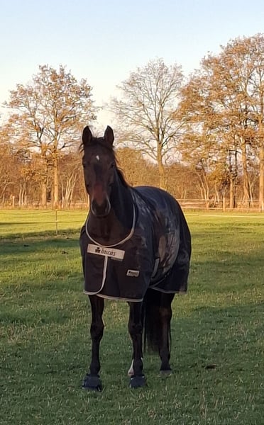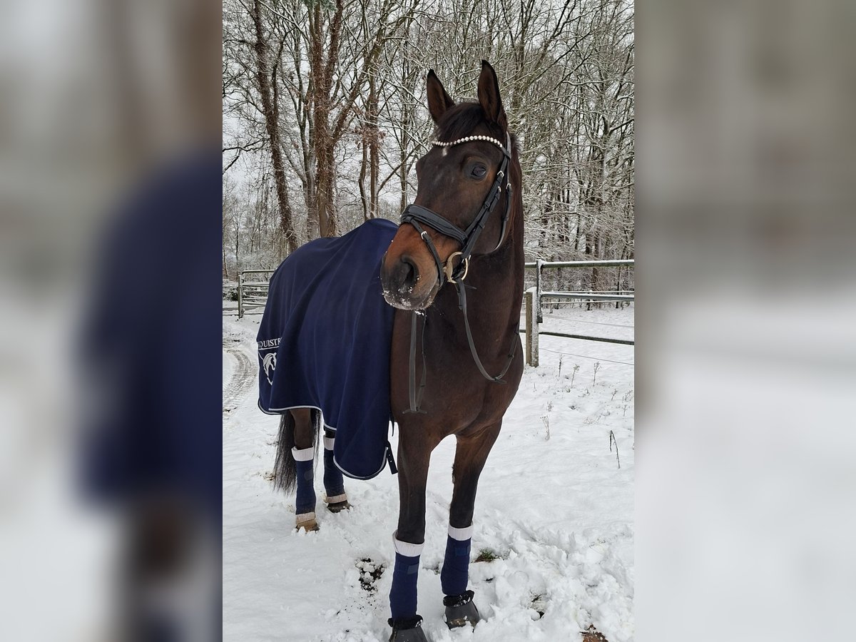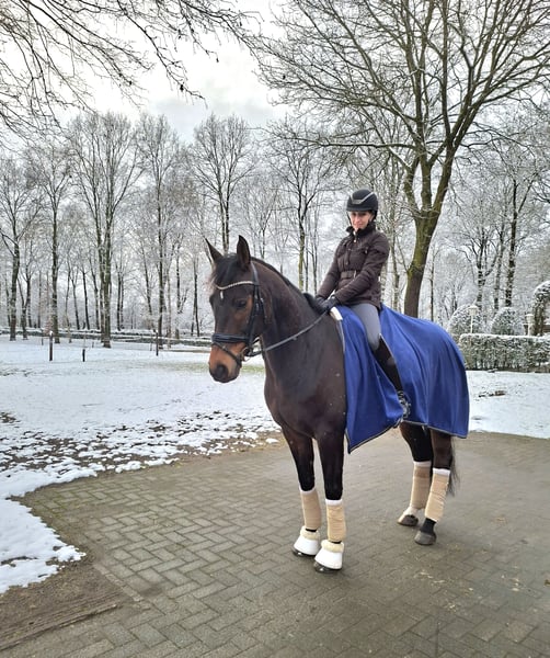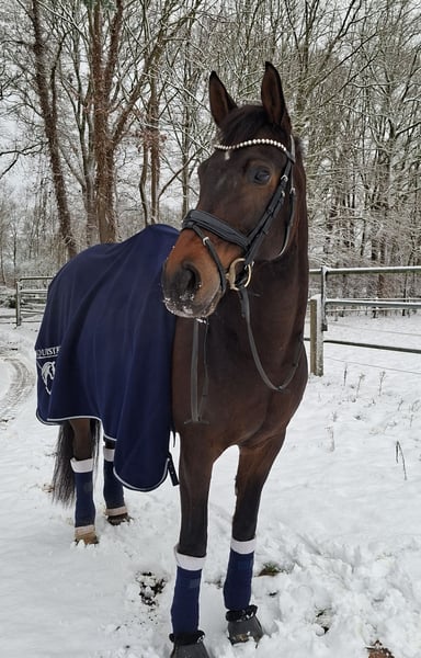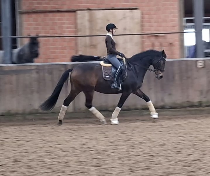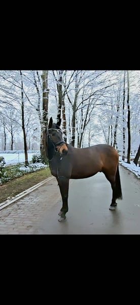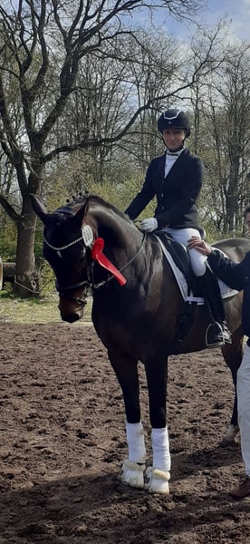 Davilord, a 9-year-old dark bay gelding, approximately 16.1 hh, by Danzador out of Mailaender. He has won at A* and A** level, placed in L, and flying changes as well as lateral work like traverses come easily and are already quite reliable. Davilord is always dependable and easy to handle for everyone, yet he remains alert and never dulls. He is suitable for any activity, whether loading alone, hacking, or gymnastics jumping, and is very trustworthy in all situations. Davilord is a very friendly and open-minded horse, a great companion for both humans and other horses. He is looking for a home where he can receive the friendship he deserves. Good older X-rays and a video are available. For inquiries, please contact me by phone or WhatsApp at 01577/1472673.