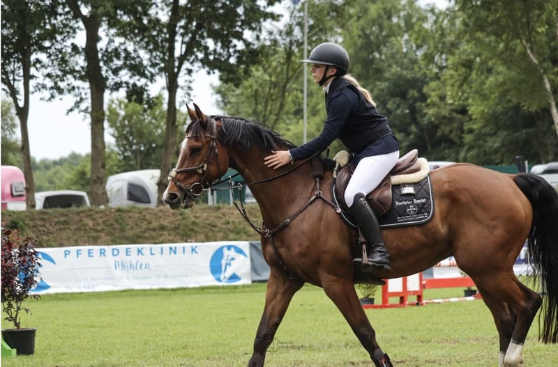 This handsome 9-year-old gelding impresses with his friendly nature. In daily handling, he is well-behaved and reliable — whether grooming, leading, or tacking up. Under saddle, he is pleasant to ride and can also be ridden by amateur riders. He competes at an elementary dressage level. Primarily, we have trained him in show jumping, and he is now confidently competing at A-level. Since we have realized that the competition environment causes him too much stress, we are looking for a rider who will primarily support him in a recreational setting. He is always well-behaved and easy to handle during clinics, in unfamiliar surroundings, and in lessons. First come, first served!