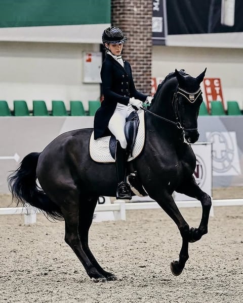 Imponująca zarówno w, jak i poza areną, ta wyjątkowa czarna klacz hanowerska odznacza się elegancją, siłą i łatwością prowadzenia, które doceniają poważni jeźdźcy ujeżdżeniowi. Osiąga naturalną, wznoszącą się równowagę i posiada wyrazistą sylwetkę, natychmiast przyciąga uwagę głębokim, czarnym jak smoła umaszczeniem, które lśni w każdym świetle, uzupełnionym o wyrafinowane, szlachetne rysy i inteligentne, czujne spojrzenie. Wyhodowana z potwierdzonych linii hanowerskich, znanych z elastyczności i łatwości nauki, łączy prawidłową budowę ciała z trzema znakomitymi chodami. Chód jest czysty i pokrywa dużą powierzchnię, z doskonałym nadkładem, stęp jest elastyczny i wyrazisty, z naturalnym unoszeniem, a kłus jest wznoszący się, zrównoważony i bardzo elastyczny — idealny do zaawansowanych ruchów. Wykazuje wyraźny talent do kolekcji, z łatwością przechodzi przez przejścia, z aktywną tylną częścią i elastyczym grzbietem, co umożliwia płynną, harmonijną pracę. Jest gotowa do skoków na wysokości 130–140 cm, przy idealnym jeźdźcu. Obecnie trenuje na poziomie zaawansowanym, pewnie wykonując ruchy takie jak zmiany galopu, półprzechody, piruety oraz wykazuje wyraźny potencjał do rozwoju na poziomie Grand Prix. Jej etyka pracy jest wyjątkowa — reaguje na jeźdźca bez nerwowości, jest chętna i napędzana, a jednocześnie łatwa do prowadzenia, co czyni ją odpowiednią zarówno dla ambitnego amatorskiego jeźdźca współpracującego z profesjonalistą, jak i dla zawodnika poszukującego wysokiej klasy partnera. W stajni jest dobrze ułożona, spokojna i łatwa w obsłudze, o łagodnym usposobieniu i chętnej naturze. Dobrze się transportuje, zachowuje się wzorowo na zawodach i szybko adaptuje się do nowych warunków. Jej temperament sprawia, że codzienna praca z nią to czysta przyjemność. Ten ogierek przeszedł kompleksowe badania weterynaryjne, w tym czyste zdjęcia rentgenowskie, a najnowszy raport weterynaryjny jest dostępny na życzenie. Jest zdrowa, pełna sił i gotowa na dalszy rozwój w konkurencyjnej karierze ujeżdżeniowej. Wyjątkowa okazja, aby nabyć naprawdę efektownego i utalentowanego hanowerskiego konia, który ma zarówno imponującą prezencję, jak i potencjał do osiągania najwyższych poziomów.