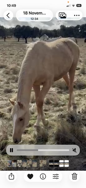 Beautiful palomino filly, born May 15, 2024, with excellent pedigree. Very pleasant and gentle. SIRE of the filly: TAPETE 75% / Hispano-Arabian stallion owned by the Spanish Military Stud Farm (Yeguada Militar). His sporting record is exceptional in conformation shows: 2000: 1st place at the Equisur competition in Jerez (at two years old). 2001: 1st place at the Equisur competition in Jerez (at three years old). 2004/2005/2006: Placed in the Écija/Sanlúcar Postal Endurance Race. “Tapete” introduced an important bloodline to the Military Stud Farm, and was considered an improver within the breed by the Spanish Union of Purebred Hispano-Arabian Breeders. In short, exceptional within his breed. (Photos: internet: "TAPETE 75% - Yeguada Militar" Dam of the filly: A beautiful pearl-colored Lusitano mare, bred in Spain, owned by the Count of Riudoms stud farm. She has a gentle temperament and is used for breeding due to her beauty.
